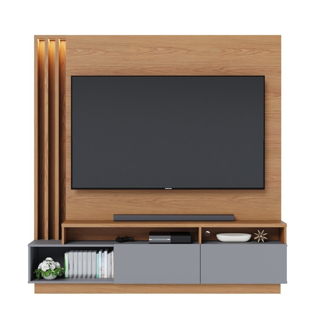 Estante Ripado Home Theater com Led Para TV até 65 Polegadas 2 Portas Humaitá Colibri Freijó/Cinza