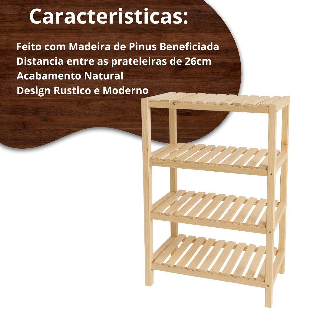 Olá, Seja Bem Vindo a PRATICI! A Prateleira 4 Andares Estante Madeira Pinus Sapateira Multiuso é a escolha ideal para quem busca uma solução prática, elegante e versátil para organizar diversos itens em qualquer ambiente. Construída em madeira de pinus de alta qualidade, esta prateleira combina durabilidade com um design moderno, sendo perfeita para uso em cantos e otimizando o espaço disponível. Características Principais: Organização Versátil: Com quatro prateleiras espaçosas, esta estante oferece amplo espaço para organizar sapatos, livros, plantas, objetos de decoração e muito mais, mantendo seu ambiente arrumado e charmoso. Design Moderno: Seu design minimalista e elegante é ideal para ambientes contemporâneos, adicionando um toque de estilo e praticidade. A prateleira de canto se encaixa perfeitamente em qualquer espaço, aproveitando áreas muitas vezes subutilizadas. Material Resistente: Fabricada em madeira de pinus de alta qualidade, esta estante garante robustez e durabilidade para uso prolongado, suportando o peso dos itens armazenados com facilidade. Fácil Montagem: Com instruções simples e todos os materiais necessários inclusos, a montagem é rápida e descomplicada, permitindo que você utilize a prateleira imediatamente após a compra. Versatilidade de Uso: Pode ser utilizada em diversos ambientes, como salas, quartos, banheiros, cozinhas, escritórios e áreas de entrada, adaptando-se facilmente às necessidades de cada espaço. Verficar a Variação antes de realizar a compra Especificações Técnicas: Material: Madeira de Pinus, garantindo resistência e durabilidade. Cor: Natural da madeira, proporcionando um visual clássico e acolhedor. Dimensões: Altura X Comprimento X Profundidade Prateleira 2 andares: 40 cm x 50 cm x 30 cm Prateleira 3 andares: 60 cm x 50 cm x 30 cm Prateleira 4 andares: 100 cm x 70 cm x 30 cm Aplicação: Montagem Simples: Siga as instruções fornecidas para montar a prateleira de forma rápida e eficiente. Aproveitamento de Espaço: Coloque a prateleira em um canto para maximizar o uso do espaço disponível e organizar seus itens de maneira prática e elegante. Manutenção: Limpe com um pano seco ou levemente umedecido para manter a prateleira sempre bonita e bem conservada. A Prateleira 4 Andares Estante Madeira Pinus Sapateira Multiuso é a solução perfeita para quem deseja otimizar o espaço de forma funcional e estilosa. Adquira já a sua e transforme seu ambiente com um toque de organização e elegância! ----------------------------------------------------------------------------------------------------- As cores dos objetos podem sofrer alteração devido a luminosidade, configurações do monitor e até mesmo a percepção do usuário. ----------------------------------------------------------------------------------------------------- Clique em "MAIS ANUNCIOS DO VENDEDOR" e veja também outros modelos disponíveis. ----------------------------------------------------------------------------------------------------- - Vocês Emitem Nota Fiscal? Sim Emitimos, toda venda sai acompanhado da nota! - Vocês possuem um SAC/Atendimento? Sim, em cada produto vendido acompanha um folder onde esta nosso contato para suporte. - De qual madeira é feita? Nossas preteleira são feitas com madeira de pinus. - Qual é a espessura da prateleira? Todas nossas prateleiras são feitas com madeiras de 2,5cm de espessura. - Quantos kg aguenta? Nossas prateleiras aguentam 30kg. estante rústica, estante de madeira, estante resistente, estante para sala, estante para quarto, estante 100x70, estante decorativa, estante vintage, estante rústica madeira, estante pequena, móvel rústico, estante multiuso, estante robusta, estante de pinus, estante charmosa, estante madeira maciça, estante estilo fazenda, estante artesanal, estante para livros, estante de apoio