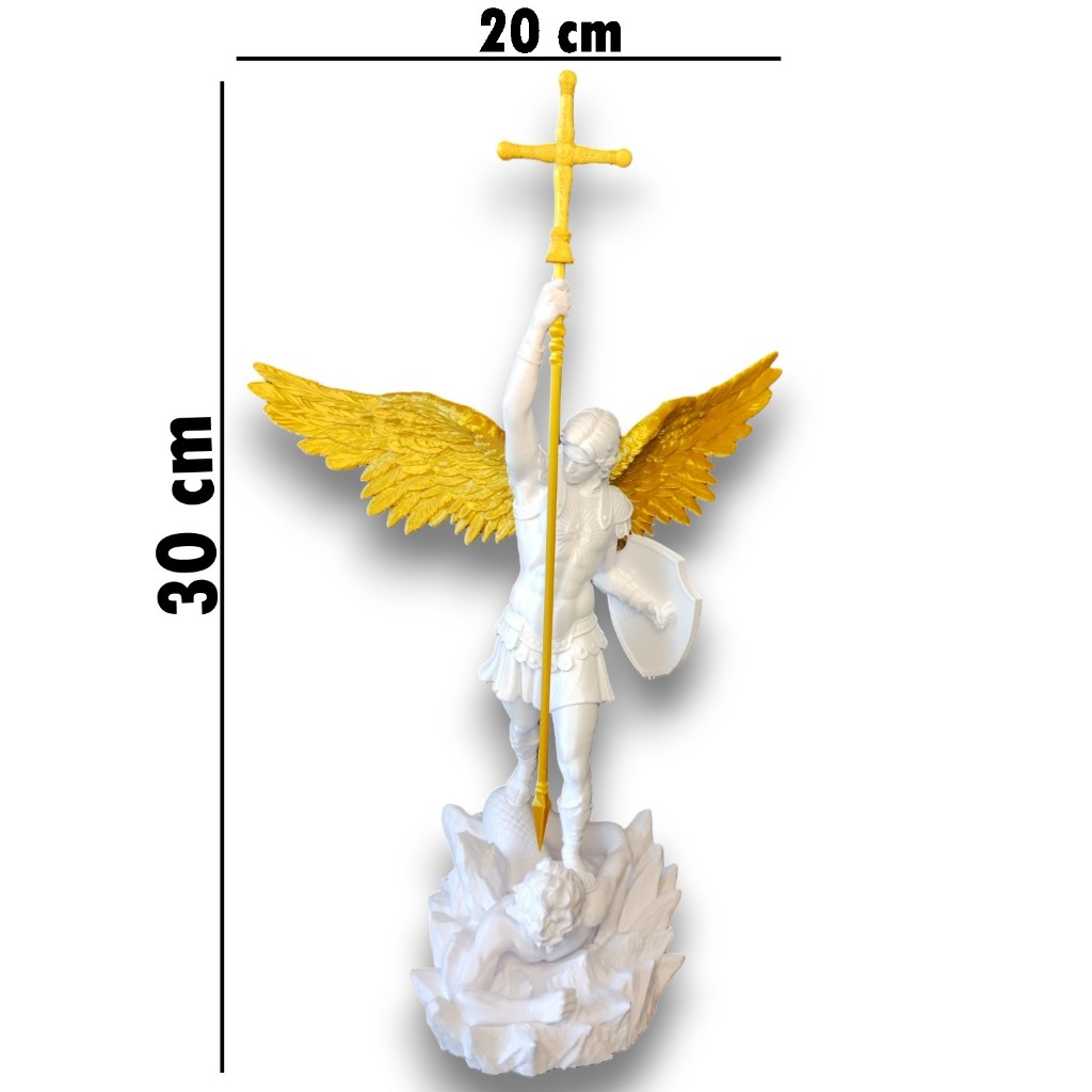 Imagem do São Miguel Arcanjo em 3D com asas e lança douradas brilhantes! Na bíblia, São Miguel Arcanjo é um dos anjos mais fortes combatendo o nosso maior inimigo das trevas, acorrentando "ele" longe de nós e de todos os lares do mundo. Tenha essa imagem em sua casa! Afastando qualquer inimigo das trevas da sua residência e da família. São Miguel Arcanjo em alta definição feito em 3D. Envio p/ todo Brasil com caixa reforçada protegendo durante o transporte. Com todo carinho, Loja Brilho Santo 3D. Tamanho Grande 30 cm de altura. Material de PLA, uma espécie de plástico. (Não recomendado para ambientes externos).