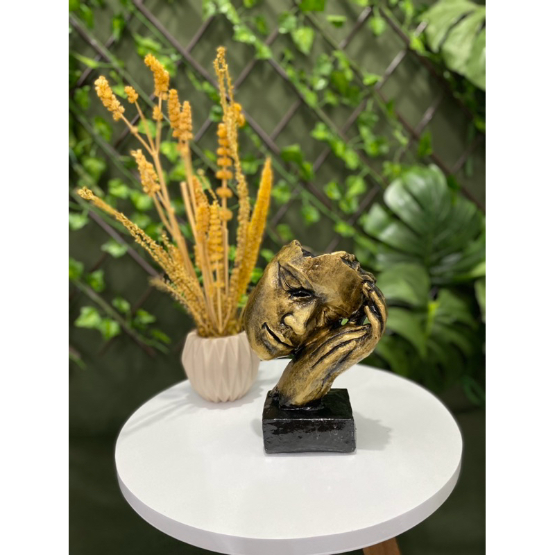 Título da Obra: "Face em Sono Dourada" Técnica de Fabricação: Feita à mão, com moldagem e acabamento detalhados Descrição Geral: Formato: Representa uma face em repouso, capturando a serenidade e a tranquilidade do sono. Expressão Facial: Relaxada, com olhos fechados e um leve sorriso, transmitindo paz e calma. Detalhes: Características sutis, como a textura da pele e as dobras naturais ao redor dos olhos e boca, esculpidas para realismo delicado. Acabamento: Cor: Dourado com um efeito envelhecido, proporcionando uma aparência sofisticada e clássica. Textura: Superfície lisa com detalhes esculpidos finos, acentuada por um acabamento que dá um toque de patina antiga. Significado: Representa a paz interior e o descanso profundo, oferecendo um espaço para contemplação e tranquilidade com um toque de realeza. Utilização e Exibição: Ambiente Ideal: Perfeita para ambientes sofisticados como salas de estar, bibliotecas ou estúdios de arte. Posicionamento: Ideal para ser colocada em um pedestal ou prateleira onde o acabamento dourado possa ser apreciado e destacado. Manutenção: Cuidados: Manter longe de umidade excessiva e limpar com um pano seco e macio para preservar o acabamento dourado e envelhecido. - Perfeito para decoração DIMENSÕES Face decoração Altura: 22cm Largura:8cm Comprimento:15cm DETALHES - gesso - tinta - escultura bem desenhada - verniz - estrutura em ferro - Tinta de melhor qualidade - feito a Mao - Muito bem detalhado EMBALAGEM -todas as nossas peças são muito bem embaladas com papel, papelão, bolha e caixa etc ENVIO o envio sempre sai antes do prazo ,em respeito ao cliente,…