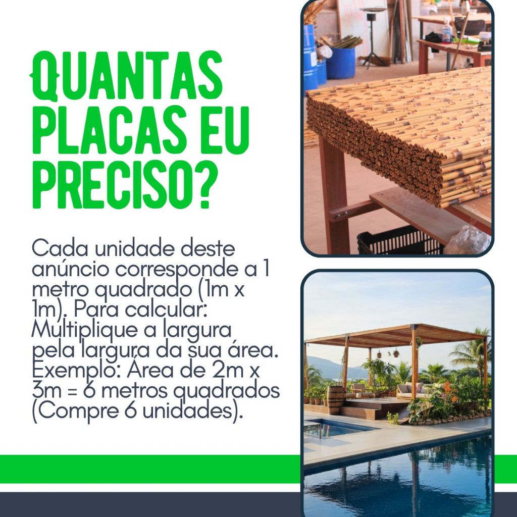ESTEIRA DE BAMBU ROLIÇO PARA FORRO (PLACA 1,00m x 1,00m) ⚠️ ATENÇÃO AO LIMITE DE FRETE: Devido ao peso e dimensões, o limite por pedido é de 5 unidades. Se precisar de mais, realize compras separadas ou nos chame no chat! Transforme seu ambiente com o conforto térmico e a estética natural do bambu. Ideal para pergolados, garagens, áreas gourmet e decoração de interiores. Acabamento de Alta Durabilidade com Amarração Estrutural Diferente dos painéis trançados comuns que afrouxam com o tempo, nossa fabricação utiliza amarração técnica com arame galvanizado. É a união da estética rústica com a durabilidade do metal: não quebra, não solta e não perde o alinhamento. 📏 QUANTAS PLACAS EU PRECISO? Cada unidade deste anúncio corresponde a 1 metro quadrado (1m x 1m). Para calcular: Multiplique a largura pela largura da sua área. Exemplo: Área de 2m x 3m = 6 metros quadrados (Compre 6 unidades). ✅ POR QUE ESCOLHER NOSSO BAMBU? DURABILIDADE: Bambu selecionado e tratado contra pragas. CONFORTO TÉRMICO: Reduz significativamente o calor sob o pergolado. ACABAMENTO PREMIUM: Bambu roliço de alta qualidade para um visual rústico e sofisticado. PRONTO PARA INSTALAR: Placas modulares que facilitam o manuseio. 🛠️ COMO INSTALAR? A instalação é simples e rápida! Pode ser fixada em estruturas de madeira, ferro ou alumínio utilizando: Abraçadeiras de Nylon (Enforca-gato) Parafusos com arruela Pregos pequenos ou arames 📦 ESPECIFICAÇÕES TÉCNICAS Medida: 1,00m x 1,00m (por placa) Material: Bambu Natural Roliço Uso: Interno ou Externo (Recomendamos aplicação de verniz para áreas descobertas) Oferecemos para nossos clientes produtos de altíssima qualidade, montamos kits de acordo com a sua necessidade, para uso pessoal ou atacado com condições especiais em grandes quantidades. Só nos mandar uma mensagem no campo de perguntas solicitando a quantidade e modelo desejado, montaremos um link de compra especialmente pra você. Todos os produtos a pronta entrega e postagem dentro de 24hs (dias úteis). Aguardamos a sua compra. Estamos sempre a disposição.