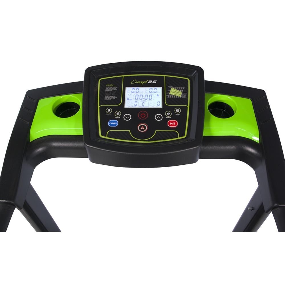 A esteira Concept 2.5 foi desenvolvida para uso residencial é dobrável, possui rodinhas para transporte e capacidade para até 130 Kg. Ela atinge velocidade máxima de 16 km/h, tem 3 níveis de inclinação, nove programas pré-definidos de velocidade e conta com um sistema de absorção de impactos com oito amortecedores que preservam as articulações do usuário, ela é perfeita para malhar as coxas, panturrilhas, glúteos e abdômen. Esse aparelho possui monitor em LCD de 5 com seis funções, sendo elas: tempo, velocidade, distância, calorias, batimentos cardíacos (Hand Grip) e programa. Desta forma você pode acompanhar o seu desempenho em tempo real e avaliar seu desempenho. Especificações: - Modelo: CONCEPT 2.5 - Motor (HP): 2.5Hp CC - Velocidade Mín (Km/h): 1 - Velocidade Máx (Km/h): 16 - Capacidade (Kg): 130 - Peso Líquido: 37,5 kg - Voltagem: 110 e 220 (bivolt) - Material: Aço Carbono - Pintura: Eletrostática pó - Funções Monitor: 6 + 9 programas - Funções Monitor (Descrição): 01 display LCD de 5, com 06 funções: tempo, velocidade, distância, calorias, batimento cardíaco (com hand grip) e programa. Possui 9 programas - predefinidos de velocidade - Amortecimento: 8 - Monitor Batimentos: com hand grip Medidas: - Comprimento: 171cm - Altura: 133cm - Largura: 72cm - Comprimento da superfício para correr: 128cm - Largura da superfície para correr: 43cm