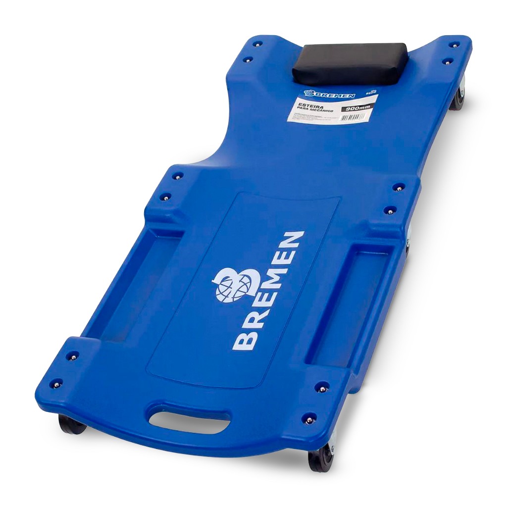 Marca: Bremen Modelo: 9500 Tipo: Esteira para mecânico Capacidade: 150 kg Cor: Azul Peso: 4 kg Dimensões: 920 x 420 x 110 mm Material do corpo: Polietileno de alta densidade (PEAD) Material das rodas: PP (interno) e PVC (externo) Acessórios: Encosto para cabeça + porta-ferramentas A esteira para mecânico Bremen é ideal para serviços na parte inferior de veículos, oferecendo praticidade, mobilidade e conforto durante os reparos. Possui corpo ergonômico fabricado em PEAD, rodas articuladas e apoio de cabeça almofadado para maior conforto. Conta ainda com porta-ferramentas laterais Aplicações: Serviços automotivos em oficinas, garagens, manutenção geral e uso profissional Conteúdo da embalagem: 1 esteira para mecânico azul Características: Produto novo Capacidade de carga de 150 kg Rodas resistentes com giro suave Corpo ergonômico e encosto de cabeça confortável Espaço lateral para ferramentas Estrutura leve e resistente Observações: Utilize sempre em superfícies planas para melhor estabilidade. Produto desenvolvido para facilitar o trabalho em posição horizontal.