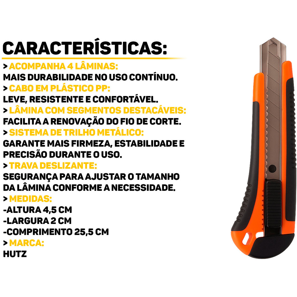 Estilete Com Trava Multiuso + Refil 4 Lâminas De Reposição 25mm Aço Carbono Profissional Hutz