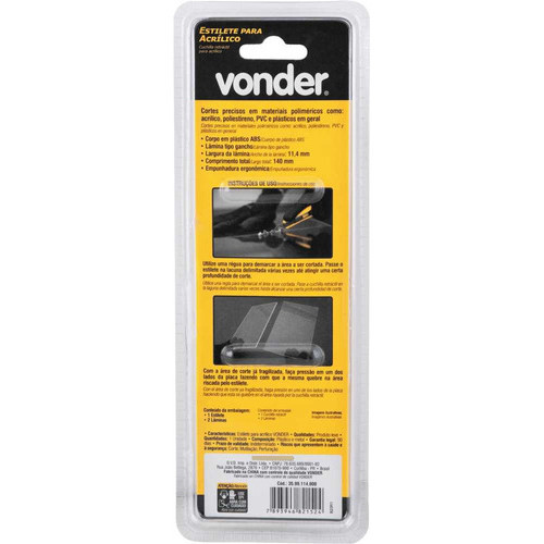 O Estilete Para Acrílico Vonder é a escolha perfeita para quem trabalha com acrílico. Com uma lâmina de 11.4 mm de largura, este estilete garante cortes precisos e limpos. Além disso, o kit inclui lâminas extras, para que você possa continuar trabalhando sem interrupções. O modelo 3599114000 da Vonder é especialmente projetado para o uso em acrílico, proporcionando facilidade e eficiência. Compre agora e tenha em mãos uma ferramenta indispensável para os seus projetos em acrílico.