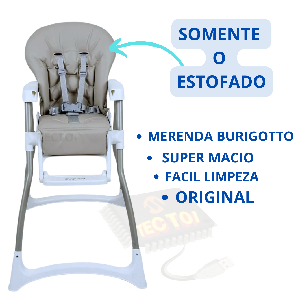 Estofado Para Cadeira Alimentação Merenda Burigotto Embalagem contém. 1 Capa acolchoada para Cadeira de alimentação Merenda Burigotto . Detalhes - Confeccionado em PVC - Impermeável - Lavável - Fácil de trocar Produto Original. Assistência autorizada Burigotto. Tectoi hospital de Brinquedos