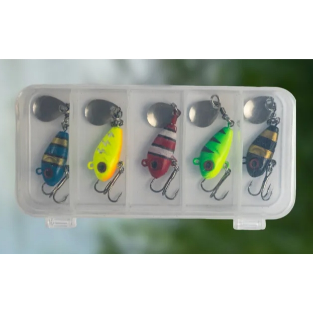 ESTOJO C/ 5 ISCAS MINI JIG SPINNER P/ PESCA TUCUNARÉ TRAÍRA BLACK BASS PEIXES PREDADORES TAMANHOS 7GR 10GR OU 15GR