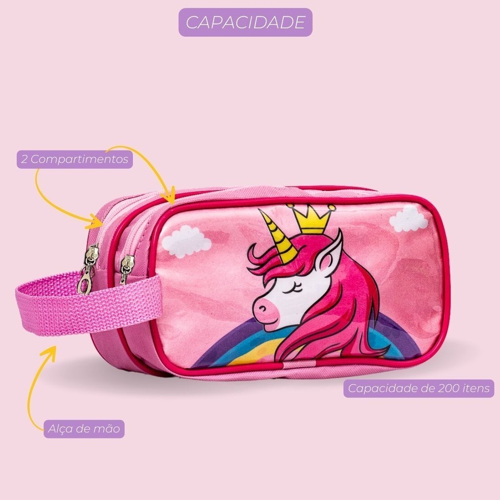 Estojo Duplo Grande Feminino Unicórnio Infantil Reforçado Premium Menina - Capacidade 200 Itens