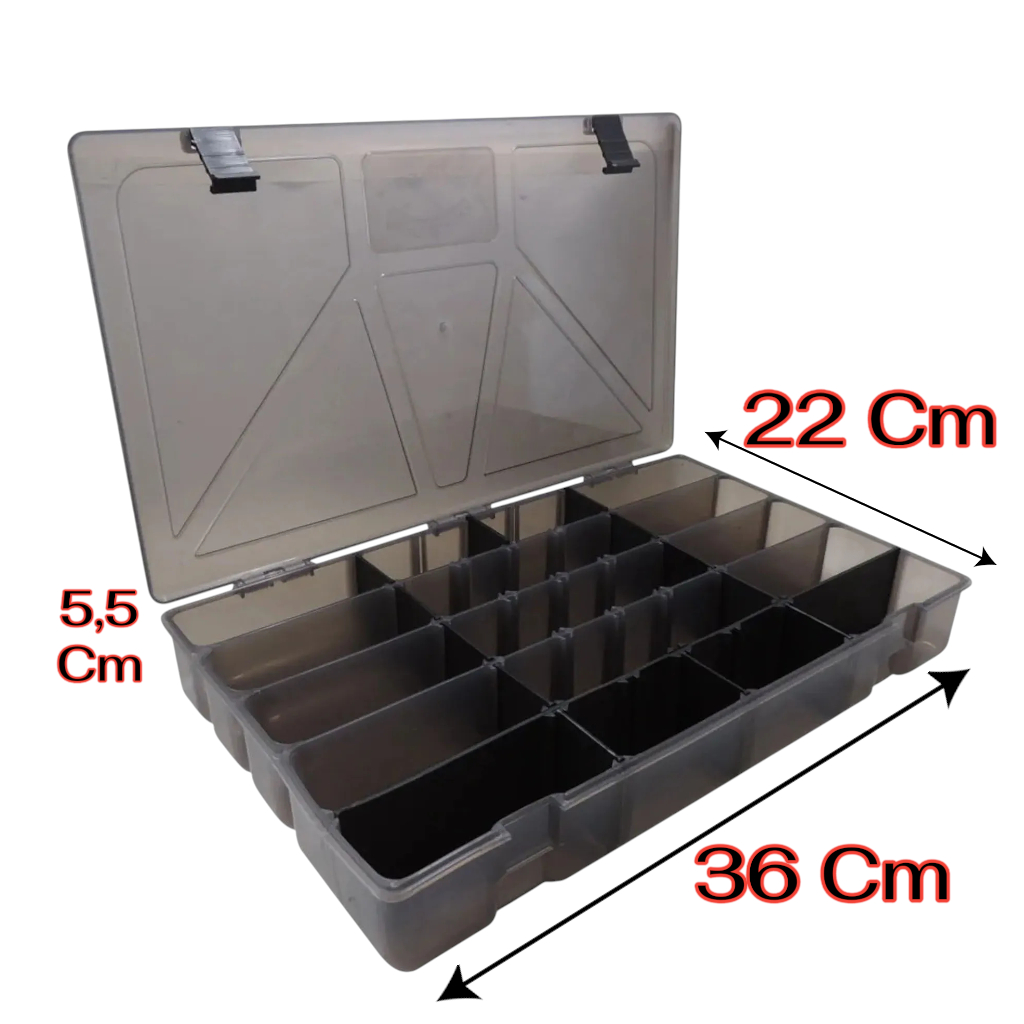 ESTOJO ORGANIZADOR BOX 50 FUMÊ PARA ISCAS ARTIFICIAIS, PARAFUSOS, BIJUTERIA ETC C/ 24 DIVISÕES - ROCHEL PESCA