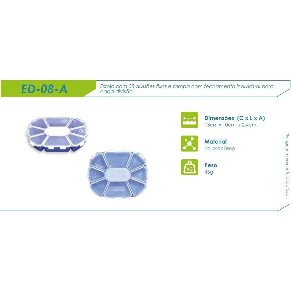 Estojo Para Pesca Hi Oitavado ED-08-A - 8 Divisões Características Estojo com 08 divisões, tampa com fechamento individual para cada divisão. Especificações Fabricante: HI Modelo: ED-08-A Material: Polipropileno Dimensões: 13 cm x 10 cm x 2,4 cm Peso: 45 g Cor: Fundo Azul e Tampa Transparente