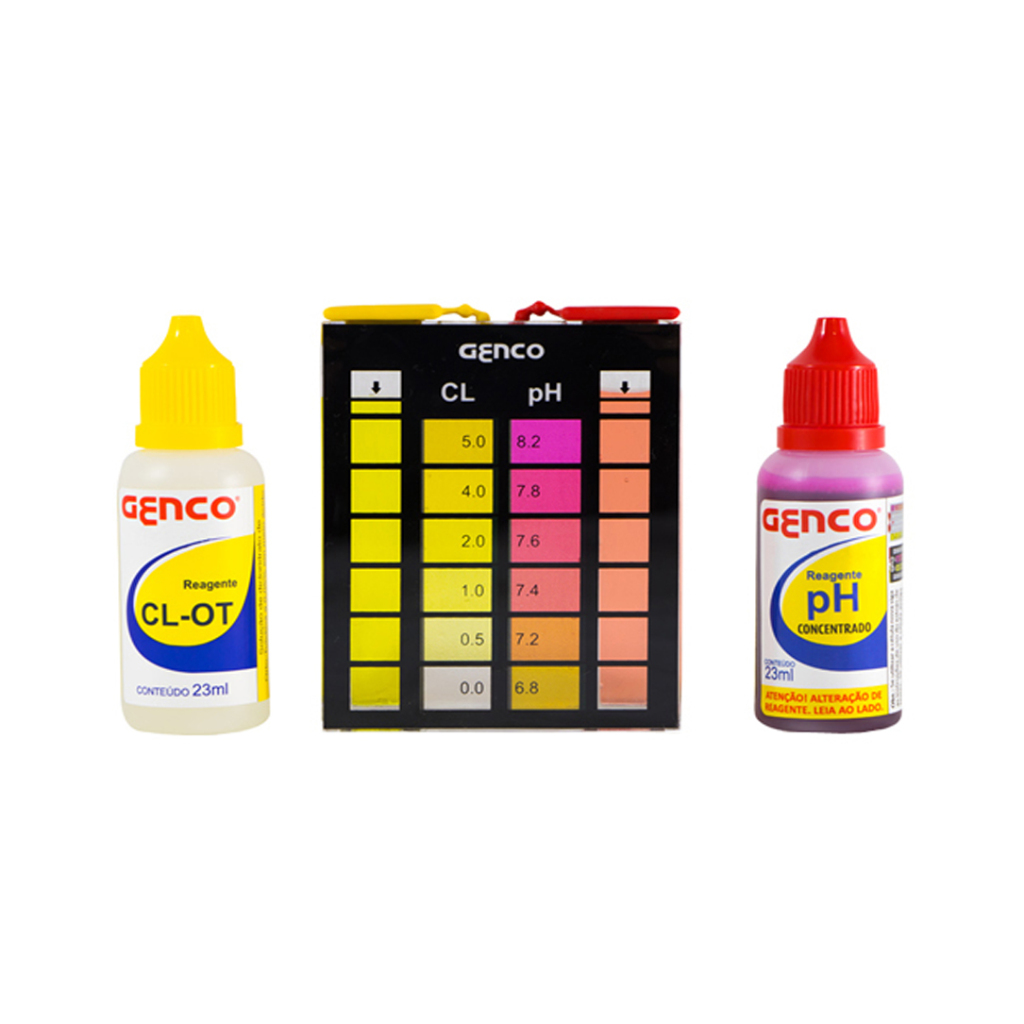 -> DESCRIÇÃO: Estojo de Testes GENCO® "3 em 1" - OT mede cloro livre, pH e alcalinidade total da água da piscina de maneira rápida e simples. -> INSTRUÇÕES DE USO: Para teste do cloro livre e pH: 1) Enxágue a célula comparadora na própria água da piscina antes e depois de cada uso. 2) Mergulhe a célula de boca para baixo até cerca de 30 cm abaixo da superfície e vire-a de boca para cima para colher amostra daquela profundidade dentro dos tubos da célula. 3) Despreze a água que exceder os níveis marcados nos tubos. 4) No tubo do lado direito, correspondente ao pH,adicione 4 gotas do REAGENTE GENCO® pH. 5) No tubo do lado esquerdo, correspondente ao cloro, adicione 4 gotas do REAGENTE GENCO® CL-OT. 6) Coloque as tampas, agite para igualar as cores formadas e compare-as com os padrões ao seu lado. -- Para teste da alcalinidade total: 1) Enxágue a célula comparadora e o tubo transparente na própria água da piscina antes e depois de cada uso. 2) Recolha no tubo transparente 25 ml de água da piscina. 3) Adicione 3 gotas do REAGENTE GENCO® AT1 e agite para igualar a cor azul formada. 4) Adicione cuidadosamente o REAGENTE GENCO® AT2 na amostra, contando gota a gota, enquanto agita o tubo transparente (sempre em círculos) entre uma gota e outra para homogeneizar a mistura, até que a sua cor passe de azul para rosa ou amarelo. 5) O resultado do teste é igual ao número de gotas utilizadas multiplicado por 10. Exemplo: 12 gotas utilizadas: Alcalinidade Total = 12 x 10 = 120 ppm (Só utilize reagentes durante seu prazo de validade) -- Faixa ideal: · pH entre 7,4 e 7,6. · Cloro livre entre 2 e 4 ppm*. Para piscinas tratadas com GENCLOR® Cloro Estabilizado GENCO® Tabletes ou Granulado ou GENCO® L.E. Cloro Granulado Múltipla Ação “3 em 1”, a faixa ideal da alcalinidade total é entre 100 e 120 ppm. ·Para piscinas tratadas com POOL-TRAT® Cloro Granulado GENCO®, a faixa ideal da alcalinidade total é entre 80 e 100 ppm. * Em piscinas públicas ou sujeitas à fiscalização sanitária seguir a legislação aplicável. -> BENEFÍCIOS: -Garante a saúde da sua piscina -Evita problemas como turbidez, incrustações e corrosão -Fácil manuseio, mesmo para iniciantes -Confiança nos resultados precisos -> VALIDADE: REAGENTE GENCO® CL-OT: 2 anos após a data de fabricação. REAGENTE GENCO® pH: 1 ano após a data de fabricação. REAGENTE GENCO® AT1: 2 anos após a data de fabricação. REAGENTE GENCO®AT2: 2 anos após a data de fabricação. -> O QUE CONTÉM NA EMBALAGEM: 1 Estojo para armazenamento (possui as instruções de uso na parte de dentro da tampa). (Medidas do estojo: 13cm de largura x 20cm de comprimento x 4,1cm de altura) 1 Reagente para teste de pH 1 Reagente para teste de CL (cloro) 2 Reagentes para teste de AT (alcalinidade total) - AT1 e AT2 1 Ampola para teste de AT (alcalinidade total) 1 Célula comparadora para cloro e pH