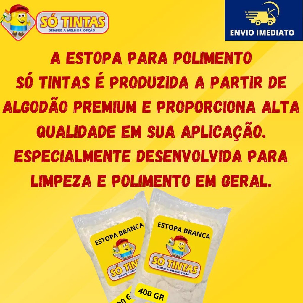 Aplicação 1.Limpeza Inicial: Utilize a estopa para remover qualquer sujeira solta, garantindo que a área esteja limpa antes do polimento. 2.Aplicação do Produto: Aplique o produto de limpeza, cera ou polidor diretamente na superfície ou na estopa. 3.Polimento: Com movimentos circulares e suaves, utilize a estopa para polir a superfície, garantindo que o produto seja distribuído uniformemente. 4.Acabamento Final: Após o polimento, use uma parte limpa da estopa para dar um toque final, removendo qualquer resíduo e realçando o brilho. 5.Limpeza da Estopa: Após o uso, lave a estopa conforme as instruções de cuidado para manter sua eficácia e durabilidade. Imagine seu veículo, ferramentas e superfícies brilhando como novos! Com a Estopa de Polimento, você alcança resultados profissionais em casa ou no trabalho. Seu polimento perfeito e suave garante que cada detalhe seja destacado, fazendo com que seus objetos tenham um acabamento impecável. Com nossa Estopa de Polimento, você terá um produto feito 100% de algodão cru, que é: •Macio e Delicado: Polimento sem riscos, ideal para todas as superfícies. •Durável e Resistente: Feita para suportar o uso intenso, mantendo sua eficácia por muito mais tempo. •Absorvente: Remove graxas e sujeiras de forma eficiente, garantindo uma limpeza profunda. •Prática: Não solta fiapos, ideal para acabamentos perfeitos. •Versátil: Perfeita para uso automotivo, industrial e doméstico. Benefícios: •Acabamento Impecável: Deixe suas superfícies brilhando como nunca. •Economia de Tempo: Com a estopa, você limpa e polido em um único passo. •Facilidade de Uso: Ideal para todos, desde profissionais até iniciantes em Dados Técnicos •Material: 100% Algodão Cru •Cor: Branca •Uso: Multiuso (limpeza e polimento de superfícies automotivas, industriais e domésticas) •Resistência: Alta durabilidade e resistência ao desgaste •Propriedades: oMaciez: Não risca superfícies delicadas oAbsorção: Excelente capacidade de absorção de líquidos oNão solta fiapos: Ideal para acabamentos impecáveis Principais perguntas: Acompanha nota fiscal? Sim, todos os nossos produtos são enviados com nota fiscal. O envio é por Correios? Pode ser enviado por Correios ou por transportadora privada, isso vai depender da disponibilidade das transportadoras que atendem o seu endereço. Porque não posso comprar mais de 4 unidades no mesmo pedido? Infelizmente há uma limitação por parte das transportadoras. Elas enviam apenas 4 unidades em cada pedido devido às dimensões e peso do pacote. Para mais unidades, você vai precisar fazer mais de um pedido, respeitando o limite máximo de 4 por pedido. Só Tintas, sempre a melhor opção. Somos a maior rede de lojas de tintas no estado do Rio de Janeiro. Desde 1977, a Só Tintas atua no Rio de Janeiro oferecendo os melhores produtos e soluções em pintura imobiliária, automotiva e industrial. Somos uma empresa familiar que começou em Teresópolis e hoje temos mais de 30 lojas físicas. Trabalhamos de forma ética e transparente, com o principal objetivo de proporcionar aos nossos clientes um atendimento de excelência, provendo as melhores soluções. Nossa missão é levar cor para a vida das pessoas. Por isso a Só Tintas é Sempre a Melhor Opção