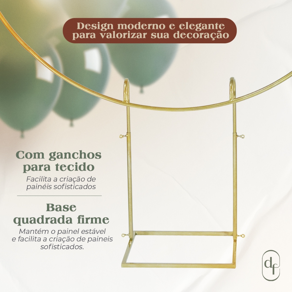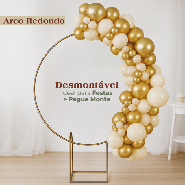 ARCO REDONDO DESMONTÁVEL PARA PAINÉIS SUBLIMADOS, BEXIGAS, ETC Com este painel em seu acervo, mil ideias e inspirações! Perfeito para quem trabalha com decoração de festas de aniversário, casamentos, confraternizações e outros momentos especiais. MATERIAL DO PRODUTO: - Fabricada em aço carbono com solda MIG – durabilidade e resistência. - Pintura eletrostática – ótimo acabamento e proteção contra ferrugem. - Cor dourado. Caso você prefira outra cor DIMENSÕES DO PRODUTO: - Diâmetro total do arco: 1,1m - Altura ajustável: 1,8m a 2,1m - Compacto, desmontável e fácil transporte. - Sistema de montagem simples e rápido, não precisa de chave para montar. CUIDADOS E MANUTENÇÃO: Para limpeza, utilize sabão ou detergente neutro com esponja macia. Não usar solventes, objetos cortantes ou abrasivos. Não deixar exposta a situações climáticas adversas por longos períodos. IMPORTANTE: Imagens meramente ilustrativas. As cores podem sofrer variações de tonalidade de acordo com a configuração da sua tela.