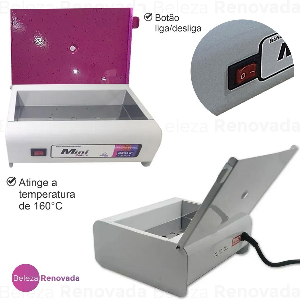 Estufa Mini Color'S + Estojo Inox + Pegador Inox - ManicureDescrição do ProdutoA Estufa MINI Color's + Estojo Inox + Pegador de Instrumentais INOX é um equipamento portátil e moderno para esterilização e secagem de alicates e instrumentos de aço inox, ideal para uso domiciliar. Com registro no Ministério da Saúde, este produto é confiável e eficiente, atingindo a temperatura de 160°C e mantendo-a constante durante todo o processo. Atributos do ProdutoMarca: Odontotécnica Modelo: Estufa Manicure Forninho Esterilizar Alicates Quantidade de Itens: 1 Kit: Não CaracterísticasA Estufa para Manicure Mini Color's possui capacidade para até 10 instrumentais ou 1 kit completo por ciclo, com potência de 200 watts. Seu design compacto e versátil conta com um compartimento e é bivolt automático, facilitando o uso em diferentes ambientes. Disponível nas cores branca com tampa em rosa, lilás, vermelha ou branca, este produto é prático e funcional para o seu dia a dia. Especificações TécnicasDimensões Externas: 85 x 220 x 185 mm Dimensões Internas: 35 x 185 x 110 mm Temperatura: Ambiente a 160°C