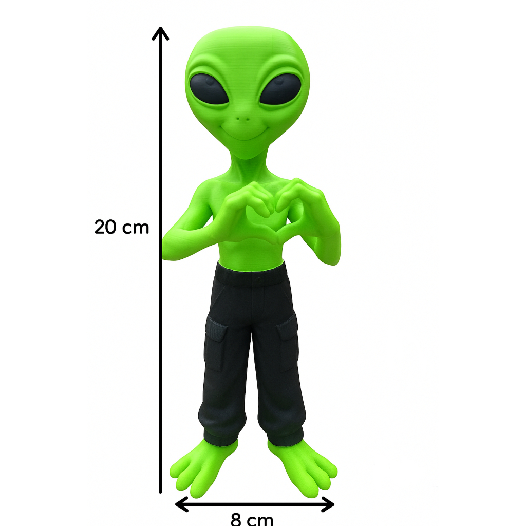 Modelo: ET Verde Colecionável Material: PLA (durável e resistente) Cor: Verde vibrante com calça preta cargo Design: Pé grande com 3 dedos, olhos expressivos e pose em formato de coração Acabamento: Superfície lisa e bem detalhada Uso: Setup Gamer , Decoração, colecionismo, presente criativo Estilo exclusivo e visual muito chamativo Ótimo para compor cenários, prateleiras, mesas e estúdios Presente perfeito para fãs de aliem, ficção científica Feito com excelente qualidade e ótima durabilidade 📦 O que vai na embalagem 1x Boneco ET Verde com Calça Cargo