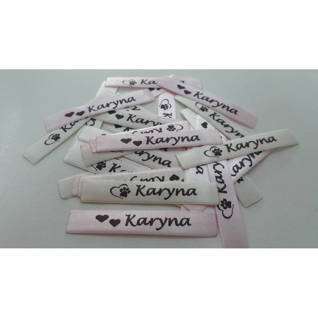 Etiquetas de Cetim Personalizadas - 100 unidades Largura da fita: 10 mm Comprimento: 8 cm Impressão exclusivamente na cor preta. Pode ser lavada. Arte simples inclusa. Pode ser enviada também a arte pronta, logotipo etc. Arquivo em png ou jpeg, preferencialmente em preto e branco. Após a confirmação do pagamento a arte e elaborada e enviada para aprovação. Cores das fitas disponíveis: BRANCO - CHAMPANHE - ROSA BEBÊ - ROSA ANTIGO - ROSÉ - PINK - LILÁS - AZUL TIFFANY - AZUL BEBE - VERDE MILITAR - AMARELO CANÁRIO - LARANJA - DOURADO A produção demora em média de 2 dias após aprovação da arte.