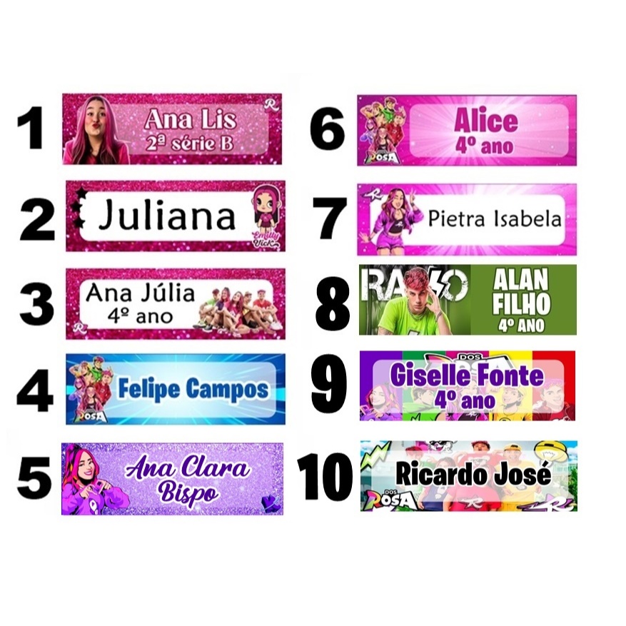 Kit com 100 etiquetas escolares impressas em papel fotográfico adesivo. *-* As etiquetas já vão recortadas prontas para aplicação no material escolar. *-* Podem se feitas em qualquer tema. *-* Personalizadas com nome e/ou ano/série/escola A T E N Ç Ã O: *** APÓS A COMPRA ENVIE IMEDIATAMENTE OS DADOS PARA IMPRESSÃO DAS ETIQUETAS POR MENSAGEM (CHAT) *** Medidas das etiquetas: - 50 unidades - 4x1,3cm - 35 unidades - 3x2cm - 15 unidades - 7x3,5cm * As medidas das etiquetas não podem ser alteradas