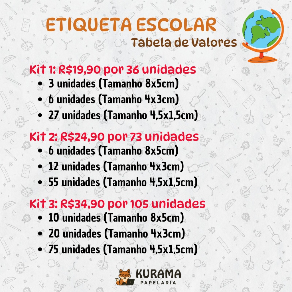 ✨ Ideal para: Estudantes! 👉 Especificações Material: Vinil Adesivo à prova d'água Kit 1: 36 unidades - 3 unidades (Tamanho 8x5cm) - 6 unidades (Tamanho 4x3cm) - 27 unidades (Tamanho 4,5x1,5cm) Kit 2: 73 unidades - 6 unidades (Tamanho 8x5cm) - 12 unidades (Tamanho 4x3cm) - 55 unidades (Tamanho 4,5x1,5cm) Kit 3: 105 unidades - 10 unidades (Tamanho 8x5cm) - 20 unidades (Tamanho 4x3cm) - 75 unidades (Tamanho 4,5x1,5cm) ❗IMPORTANTE: • Após realizar a compra do nosso kit de etiquetas escolares, envie as informações (nome, ano e turno) pelo chat da Shopee. • Prazo para Produção e Envio: 3 dias úteis