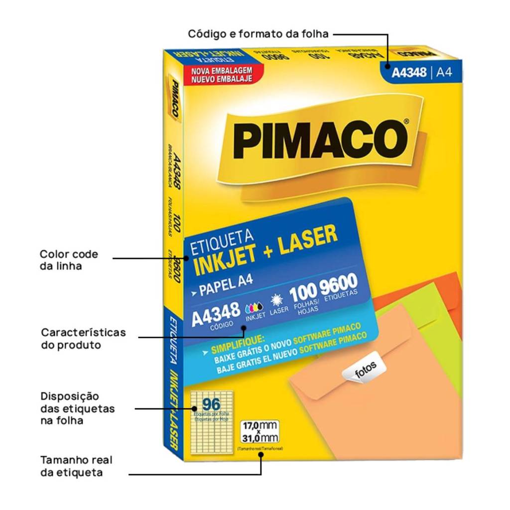 Etiqueta inkjet/laser A4348 - com 100 folhas - Pimaco As etiquetas pimaco podem ser amplamente utilizadas no trabalho ou em casa. sempre mantendo um alto nível de apresentação. São diversos modelos e quantidades para suprir qualquer demanda. Detalhes: - Impressão: Inkjet e Laser. - Etiquetas por folhas 96 - Quantidade de etiqueta: 9.600 unidades - Medidas: 17.0 x 31.0 mm