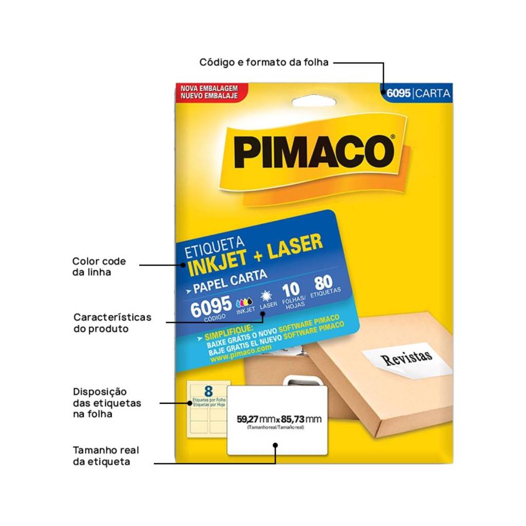 Etiqueta inkjet/laser carta 6095 com 10 folhas - Pimaco As etiquetas pimaco podem ser amplamente utilizadas no trabalho ou em casa. sempre mantendo um alto nível de apresentação. São diversos modelos e quantidades para suprir qualquer demanda. Detalhes: - Impressão: Inkjet e Laser. - Etiquetas por folhas 8 - Quantidade de etiquetas: 80 unidades - Medidas: 59.27 x 85.73 mm
