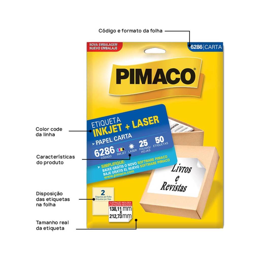 Etiqueta inkjet/laser carta 6286 com 25 folhas - Pimaco As etiquetas pimaco podem ser amplamente utilizadas no trabalho ou em casa. sempre mantendo um alto nível de apresentação. São diversos modelos e quantidades para suprir qualquer demanda. Detalhes: - Impressão: Inkjet e Laser. - Etiquetas por folhas 2 - Quantidade de etiquetas: 50 unidade - Medidas: 138.11 x 212.73 mm