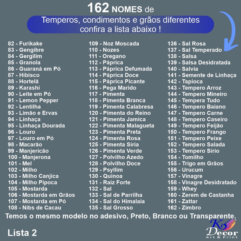162 ADESIVOS PARA POTES DE TEMPEROS E CONDIMENTOS Nós da KiDecor agradecemos sua compra. NÃO REALIZAMOS ALTERAÇÕES NA ARTE. Os adesivos são entregues em rolos, cortados, depilados e pronto para uso. MATERIAL; ADESIVO VINIL PLASTICO IMPRESSÃO; PLOTTER HP LATEX ALTA RESOLUÇÃO RESISTIENTE A ÁGUA LISTA DE TEMPEROS CONTENDO NAS ETIQUETAS. A - Açafrão, Achocolatado, Açucar, Açucar Demerara, Açucar Mascavo, Açucar Refinado, Ajinomoto, Alecrim, Alho, Alho em Flocos, Alho em Lâminas, Alho em Pó, Alho Frito, Alho Ralado, Ana Maria, Anis Estrelado, Arroz Branco, Arroz Integral, Arroz Vermelho, Aveia, Aveia em Flocos, Azeite; B – Baunilha, Bicarbonato, Biscoito/Bolacha; C – Cacau em Pó, Café, Caiena, Cajun Spice Mix, Camomila, Canela, Canela em Pau, Canela em Pó, Cardamomo, Castanha de Caju, Castanha do Pará, Cebola Desidratada, Cebola em Flocos, Cebola em Pó, Chá, Cheiro Verde, Chia, Chili, Chimi-Churri, Chocolate em Pó, Coco Ralado, Coentro, Colorau, Cominho, Cookies, Cran Berry, Cravo, Cravo da Índia, Cúrcuma, Curry, Cuscuz; D – Dill (Endro), Doces, Dry Hub,; E – Edu Guedes, Ervas de Provence, Erva Doce, Ervas Finas, Estragão; F – Farelo de Aveia, Farinha Amarela, Farinha Crocante, Farinha de Amêndoas, Farinha de Mandioca, Farinha de Trigo, Farinha Láctea, Farofa, Farofa Picante, Feijão, Feijão Carioca, Feijão de Corda, Feijão Fradinho, Feijão Preto, Flocão de Milho, Fubá, Funcho, Furikake; G – Gengibre, Gergelim, Granola, Guaraná em Pó; H – Hibisco, Hortelã; K – Karashi; L – Leite em Pó, Lemon Pepper, Lentilha, Limão e Ervas, Linhaça, Linhaça Dourada, Louro, Louro em Pó; M - Macarrão, Manjericão, Manjerona, Mel, Milho, Milho Canjica, Milho P/ Pipoca, Mostarda, Mostarda em Grão, Mostarda em Pó; N – Nibis de Cacau, Noz Moscada, Nozes; O – Orégano; P – Páprica, Páprica Defumada, Páprica Doce, Páprica Picante, Pega Marido, Pimenta, Pimenta Branca, Pimenta Calabresa, Pimenta do Reino, Pimenta da Jamaica, Pimenta Preta, Pimenta Rosa, Pimenta Siria, Pimenta Verde, Polvilho, Polvilho Doce, Polvilho Azedo, Psyllium; Q – Quinoa; R – Raiz Forte; S – Sal, Sal de Parrilha, Sal do Himalaia, Sal Grosso, Sal Rosa, Sal Temperado, Salsa, Salsa Desidratada, Sálvia, Semente de Linhaça; T – Tapioca, Tempera Tudo, Tempero Arroz, Tempero Baiano, Tempero Carne, Tempero Caseiro, Tempero Feijão, Tempero Frango, Tempero Mineiro, Tempero Peixe, Tempero Sírio, Tempero Salada, Tomilho, Trigo em Grãos; U – Urucum, V – Vinagre, Vinagre Desidratado; W – Whey; Z – Zattar, Zimbro;