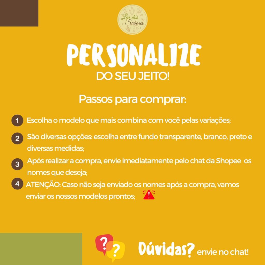 ✨ ADESIVOS ORGANIZADORES PERSONALIZADOS PARA TEMPEROS, CONDIMENTOS E MANTIMENTOS Transforme sua cozinha com praticidade e estilo! Somos fábrica há mais de 20 anos, oferecendo qualidade, durabilidade e bom gosto para quem ama tudo organizado e funcional. 🏷️ FICHA TÉCNICA ✔ Quantidade: escolha a opção desejada nas variações ✔ Tamanho: disponível em diferentes medidas, selecione a que preferir ✔ Modelos: diversos layouts para combinar com sua cozinha ✔ Material: Vinil branco, transparente ou fosco – você escolhe! 🌟 VANTAGENS DOS NOSSOS ADESIVOS 💧 À prova d’água – Resistentes à umidade e respingos, ideais para o dia a dia na cozinha 🖨️ Alta definição – Impressão nítida (1400 dpi), com letras legíveis e elegantes 📦 Fáceis de aplicar – Cortes individuais em cartelas práticas: é só destacar e colar! 🖐️ Toque premium – Acabamento refinado para um visual discreto e elegante 💪 Alta durabilidade – Não rasgam com facilidade e mantêm a beleza por muito tempo 🧂 Organização com estilo – Deixe tudo no seu lugar com um visual limpo e funcional ❓ DÚVIDAS FREQUENTES 🔹 Posso escolher os nomes dos adesivos? Sim! Você informa os nomes que deseja e nós produzimos exatamente como solicitado. 🔹 Preciso enviar os nomes logo após a compra? Sim, o ideal é enviar a lista em até 24 horas para garantir a produção rápida do seu pedido. ➡️ Importante: caso não seja enviada a lista dentro do prazo, enviaremos modelos prontos, já padronizados. 📩 Ficou com dúvidas? Estamos à disposição para te ajudar com o que for preciso. 🛍️ Obrigado por escolher nossos produtos! Lar dos Sabores – quem organiza com amor, tempera com carinho.