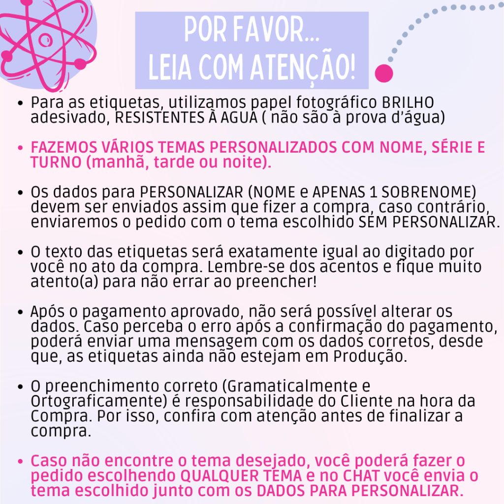 ETIQUETAS ESCOLARES PERSONALIZADAS + BRINDE Identificação completa, personalizada e cheia de carinho. Evite perdas, trocas e confusões na escola com nossas Etiquetas Escolares Personalizadas, feitas com impressão profissional, materiais de alta qualidade e acabamento impecável. Perfeitas para identificar todo o material escolar de forma prática e bonita. OPÇÕES DE KIT (ESCOLHA NO ANÚNCIO): KIT 1 – ETIQUETAS + CHAVEIRO PERSONALIZADO 86 etiquetas escolares personalizadas 01 chaveiro de acrílico personalizado (BRINDE) Detalhes do chaveiro: • Material: Acrílico • Tamanho aproximado: 3 x 4 cm • Personalizado no tema escolhido • Com o nome da criança KIT 2 – KIT COMPLETO 86 etiquetas escolares personalizadas 01 chaveiro de acrílico personalizado (3 x 4 cm) 01 régua personalizada de 15 cm 01 marca-página de acrílico personalizado de 14 cm Todos os itens seguem o mesmo tema, com nome personalizado, formando um kit lindo, funcional e perfeito para a volta às aulas. TAMANHOS DAS ETIQUETAS: Tamanho P – 3cm x 3,5cm Ideal para lápis, canetas e canetinhas Envolve todo o lápis, oferecendo mais segurança para não descolar Tamanho M – 4cm x 5cm Ideal para colas, agendas e cadernos de recado Tamanho G – 5cm x 6,5cm Ideal para cadernos A4, livros, apostilas e pastas MATERIAL E ACABAMENTO: Papel Fotográfico Glossy Adesivo 115g Impressão profissional de alta qualidade Recorte preciso em máquina (acabamento perfeito) Excelente fixação e durabilidade PERSONALIZAÇÃO: Após a compra, envie pelo chat da Shopee: Nome + 1 Sobrenome Série (Exemplo: 1º Ano / 2º Ano / 3º Ano) Turno (Exemplo: Manhã / Tarde ) Tema desejado Caso as informações não sejam enviadas, o pedido será enviado sem personalização. INFORMAÇÕES IMPORTANTES: • Produto personalizado, não realizamos trocas ou devoluções após a personalização • As cores podem sofrer leve variação conforme a tela • Produção artesanal com padrão profissional Escolha seu kit, finalize a compra e garanta agora um material escolar lindo, organizado e exclusivo! VANTAGENS DE TER NOSSAS ETIQUETAS ✔ Organização total do material escolar da criança ✔ Personalizadas com nome e série ✔ Prontas para uso ✔ Resistentes à água e ao uso diário ✔ Impressão com brilho e cores vibrantes ✔ Duráveis – não desbotam facilmente ✔ Vários tamanhos para cada tipo de material ✔ Temas fofos e exclusivos ✔ Envio rápido (até 4 dias úteis) ✔ Acabamento profissional