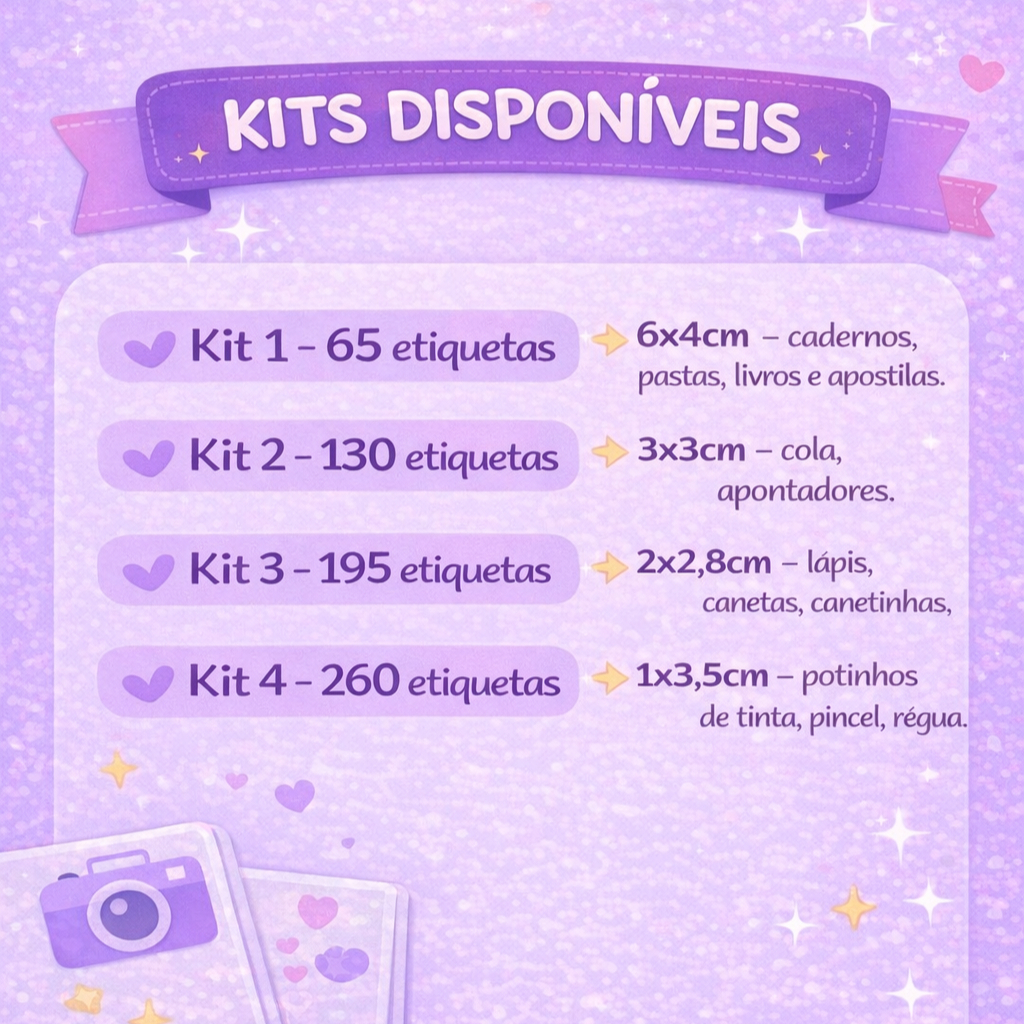 **LEIA A DESCRIÇÃO COM ATENÇÃO ANTES DE REALIZAR A COMPRA** KITS DISPONÍVEIS: - KIT 1: 65 etiquetas - 4 etiquetas 4x6cm + 18 etiquetas 3x3cm + 27 etiquetas 2x2,8cm + 16 etiquetas 1x3,5cm - KIT 2: 130 etiquetas - 8 etiquetas 4x6cm + 36 etiquetas 3x3cm + 54 etiquetas 2x2,8cm + 32 etiquetas 1x3,5cm - KIT 3: 195 etiquetas - 12 etiquetas 4x6cm + 54 etiquetas 3x3cm + 81 etiquetas 2x2,8cm + 48 etiquetas 1x3,5cm - KIT 4: 260 etiquetas - 16 etiquetas 4x6cm + 72 etiquetas 3x3cm + 108 etiquetas 2x2,8cm + 60 etiquetas 1x3,5cm TAMANHOS AVULSOS: - Tamanho GG 5x8 cm - 10 etiquetas (cadernos, pastas, apostilas) - Tamanho G 4x6 cm - 18 etiquetas (cadernos, pastas, apostilas) - Tamanho M 4x4 cm - 24 etiquetas (cadernos, pastas, apostilas, materiais diversos) - Tamanho P 2x5 cm - 40 etiquetas (lápis, caneta, canetinha, materiais diversos) - Tamanho PP 2x2,8 cm - 72 etiquetas (lápis, caneta, canetinha) ###Após a compra enviar via chat dados a serem personalizados. ESPECIFICAÇÕES: - Etiquetas impressas em papel fotográfico adesivo 80g, fino de boa qualidade para melhor aderência no material. - Não são à prova d’água, não é recomendado molhar. - Etiquetas cortadas manualmente, não vão em cartelas. - É permitido apenas 1 nome por kit/tamanho de etiqueta. - As etiquetas podem ser personalizadas com nome e série/ano escolar, enviar as informações através do campo de mensagem ou chat. ### ATENÇÃO: prazo de produção e envio será informado no chat, varia conforme a demanda. * Após o pagamento o cliente concorda com o prazo estipulado no anúncio. ATENÇÃO A TODAS AS INFORMAÇÕES * Não vendemos os demais itens da foto (marca página e régua) SOMENTE AS ETIQUETAS, e não acompanha em nenhum kit, foto ilustrativa para mostrar a arte. * Não é possível fazer alterações nas quantidades e tamanhos do produto. * O NÃO envio dos dados para personalização, será enviado o produto em branco. * Atenção especial aos tamanhos dos produtos descritos acima. * Não realizamos nenhuma alteração na arte. É enviada para aprovação e correções ortográficas antes do envio do produto. * As cores podem sofrer uma pequena variação de acordo com cada monitor ou tela do celular. * Tire todas as suas dúvidas via chat antes de realizar a compra, estamos a disposição.