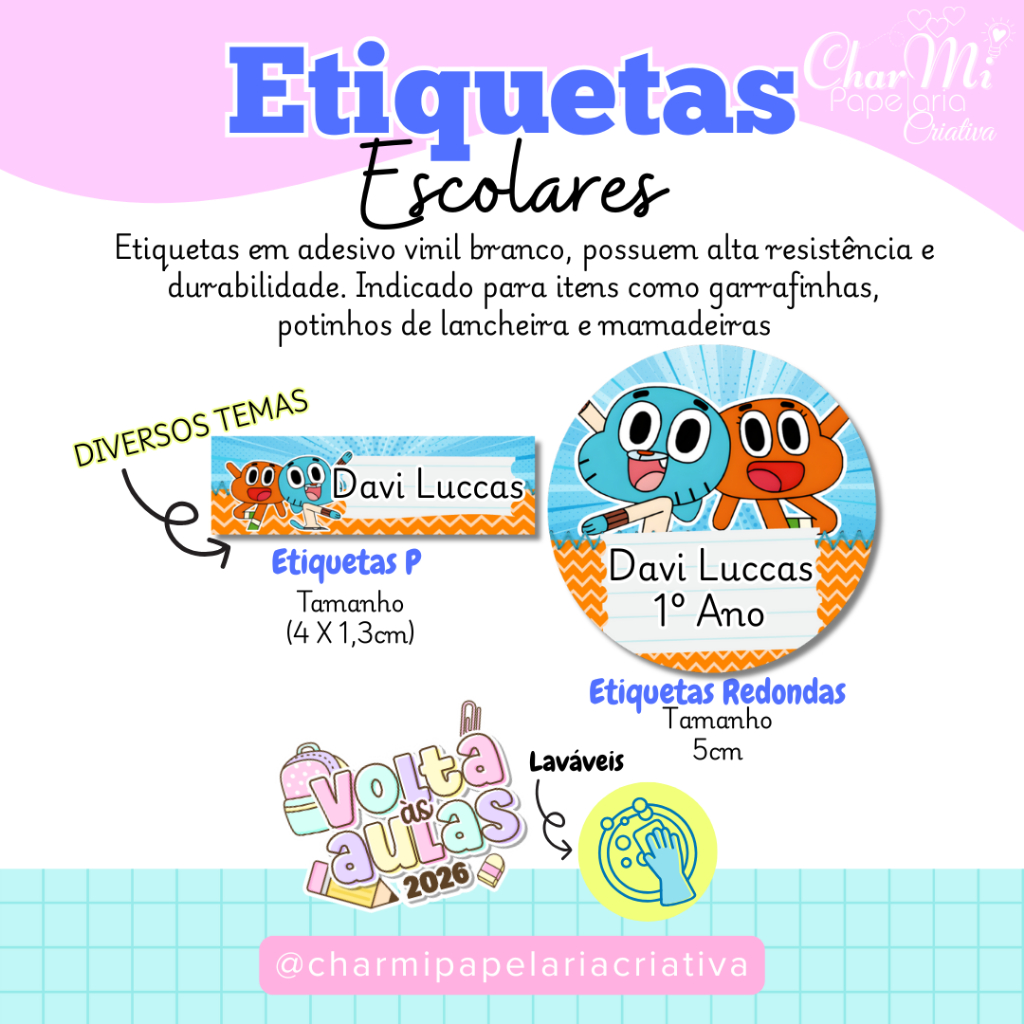 🎒✏️ Volta às aulas Etiquetas escolares personalizadas - TEMOS DIVERSOS TEMAS Deixe tudo organizado e com a carinha do seu pequeno! 😍📚 📌 Chegou a hora de organizar o material escolar com muito estilo! Nossas etiquetas personalizadas são ideais para cadernos, livros, lápis e muito mais! São produzidas em Vinil Branco Adesivo à prova d'água Impressão em alta qualidade, mantendo as cores lindas e vibrantes ⚠️A cores do produto vista pelo celular ou computador podem variar devido à iluminação ambiente, às configurações da tela do dispositivo (brilho, contraste, saturação) e à resolução do monitor. ⚠️Os adesivos já vão recortados, prontinhos para destacar e cola ✨ 14 ETIQUETAS Disponíveis em 02 Tamanhos * 4 x 1,3cm * 5cm 💪 Impressão de qualidade em Vinil Branco Adesivo à prova d'água 🎨 Personalize com nome + personagem/tema ✅ Ótimo para escolas, creches e uso diário *PRAZO DE PRODUÇÃO: 07 DIAS ÚTEIS *📦IMPORTANTE: VERIFIQUE O PRAZO DE ENTREGA PARA GARANTIR QUE O SEU PRODUTO CHEGUE A TEMPO DA SUA NECESSIDADE. *OBS: APÓS A COMPRA INFORME IMEDIATAMENTE NO CHAT NOME, 01 SOBRENOME E SÉRIE ESCOLAR, PARA A PERSONALIZAÇÃO. ESSA INFORMAÇÃO É DE INTEIRA RESPONSABILIDADE DO CLIENTE E DE EXTREMA IMPORTÂNCIA. *NÃO FAZEMOS ATERAÇÕES NAS ARTES; 💬 Qualquer dúvida, chama no chat! 👉 Clique em “COMPRAR AGORA” e garanta Com a CharMi Papelaria Criativa, organização e fofura para a volta às aulas!