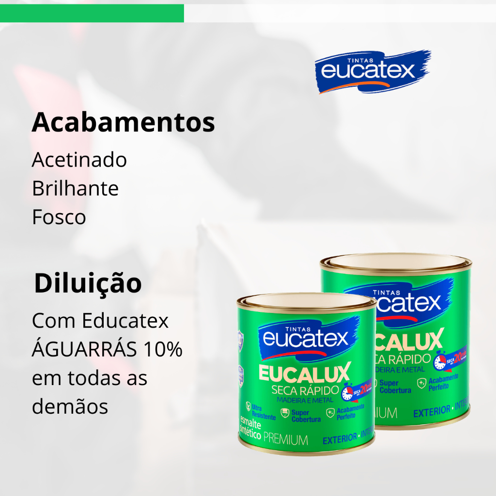 | Eucalux Seca Rápido Esmalte Premium Eucatex 900ml Cores este produto | R$ 46,90 | 6% | 5.0/5 | 10 |