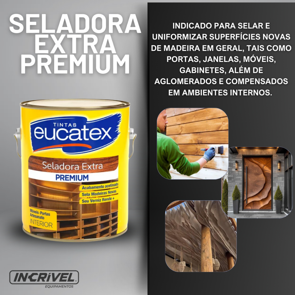 Eucatex Seladora Extra Incolor Premium Acetinada - 3,6l ..................................................................................................................................... INFORMAÇÕES SOBRE O PRODUTO ..................................................................................................................................... Eucatex Seladora Extra Premium é um produto indicado para selar e uniformizar superfícies novas de madeira em geral, tais como portas, janelas, móveis, gabinetes, além de aglomerados e compensados em ambientes internos. Sua fórmula concentrada proporciona maior rendimento, é de fácil aplicação e lixamento, oferecendo boa cobertura dos poros e ótimo poder de enchimento, formando uma película flexível e transparente. DÚVIDAS FREQUENTES ..................................................................................................................................... Pergunta: Como é embalado o produto? Resposta: Todos os nossos produtos vendidos são embalados em caixas lacradas ou plástico stretch. Em respeito ao meio ambiente 90% das caixas são reutilizadas. Pergunta: Quem faz a entrega? Resposta: A entrega é terceirizada, feita via CORREIOS ou TRANSPORTADORA. Pergunta: O envio é feito em quantos dias? Resposta: Nós enviamos o seu pedido no prazo máximo de 24 horas após a confirmação de sua compra, sendo um dos envios mais rápidos da plataforma. Pergunta: Os produtos são novos ou usados? Resposta: Todos os produtos que trabalhamos são novos e com qualidade garantida. .....................................................................................................................................