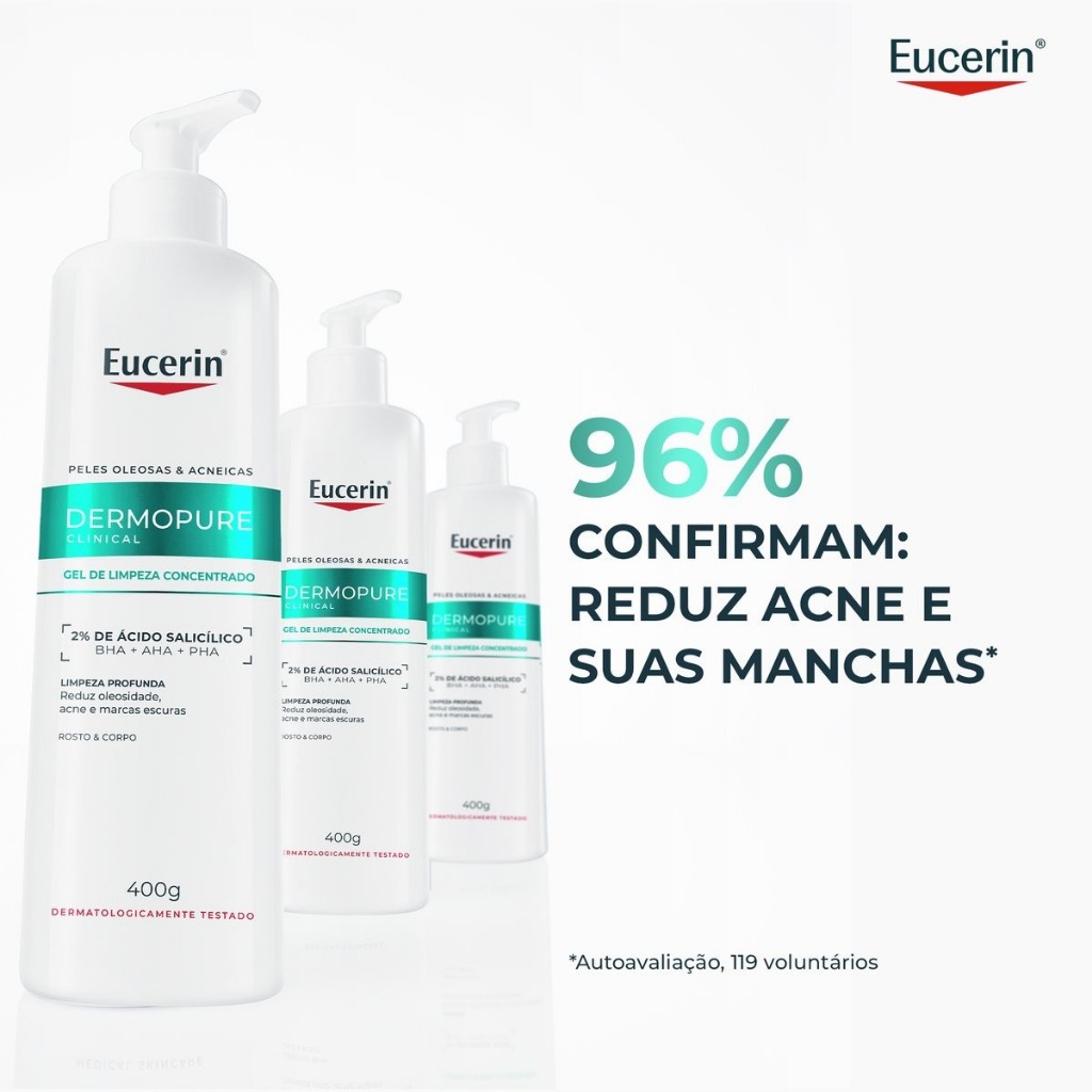 Eucerin Dermo Pure Gel de Limpeza Facial Concentrado limpa a pele, auxiliando no combate à acne e redução da oleosidade, ao mesmo tempo que remove a maquiagem, sujeira e impurezas. Desenvolvido com 2% de Ácido Salicílico, que controla a oleosidade e auxilia no combate de cravos e espinhas, sua fórmula dermatológica também inclui Complexo de Hidroxiácidos, que combatem marcas escuras pós-acne. Com textura em gel, promove uma limpeza profunda. Resultados visíveis em apenas 7 dias. Desenvolvido especialmente para peles oleosas e acneicas. A fórmula concentrada oferece um efeito triplo, combatendo marcas, acne e o brilho excessivo da pele. Limpa profundamente a pele, removendo impurezas, cravos e excesso de oleosidade, ao mesmo tempo em que ajuda a combater espinhas, reduzir marcas pós-acne e controlar o brilho excessivo. Ele promove renovação celular e melhora a textura da pele, sem ressecar ou obstruir os poros. Sua fórmula é livre de sabão, álcool e parabenos e contém 6% de tensoativos anfotéricos. A pele fica limpa, fresca e macia. Não comedogênico. Reduz poros visíveis. Os consumidores que testaram, confirmam: • 100% textura agradável* • 99% sentiram limpeza profunda* • 97% notaram a redução da acne* • 97% disseram que reduziu a oleosidade* • 95% afirmam ter vencido no combate das marcas escuras pós-acne* *Teste de percepção realizado com 100 voluntários durante 4 semanas de uso regular, duas vezes ao dia. ---- DÚVIDAS FREQUENTES ---- Os produtos são originais? Sim. Todos os nossos produtos são originais. Emitem nota fiscal? Sim. Emitimos nota fiscal para todos os pedidos.