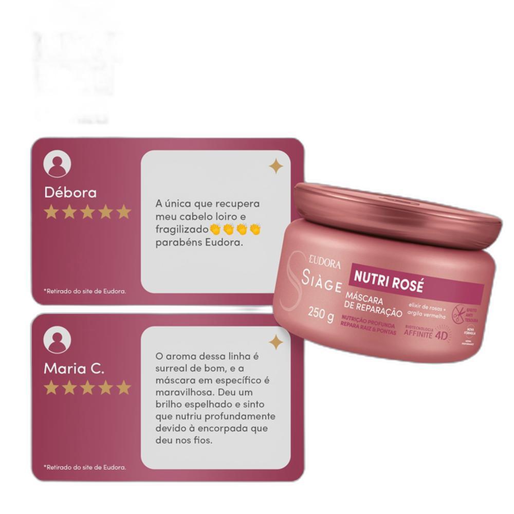 A Máscara Capilar Siàge Nutri Rosé hidrata profundamente e repara as áreas fragilizadas dos fios por todo seu comprimento. Sua fórmula com Elixir de Rosas, entrega um ativo poderoso obtido através da colheita de 30 mil pétalas de rosas que garantem a reparação dos fios por inteiro. Com o incrível Efeito Anti-tesoura não será mais necessário recorrer ao corte para ter cabelos lindos e saudáveis. Além de devolver sua resistência natural, evitando que eles se quebrem facilmente. Proporciona cabelos com toque macio, mais resistentes, com brilho natural e benefícios como: Nutrição profunda até a 3ª camada do fio;Reparação instantânea e duradoura, sem pesar;Raiz saudável e comprimento livre de pontas duplas;Livre de Petrolatos, Parabenos e Sal. A Máscara Capilar Siàge Nutri Rosé chegou para você dizer adeus às tesouras! SOBRE A LINHA A linha Siàge Nutri Rosé é enriquecida com um poderoso Elixir de Rosas, rico em vitaminas e antioxidantes que nutrem os fios e tem alto poder de reparação, combinado a natural Argila Vermelha que nutre os fios, promovendo equilíbrio ao couro cabeludo e reparação profunda da raíz às pontas. Nenhum produto Eudora é testado em animais, ou seja, este item possui selo Cruelty Free. **** IMPORTANTE: Não vendemos para contas CNPJ, evite que seu pedido seja cancelado! ****