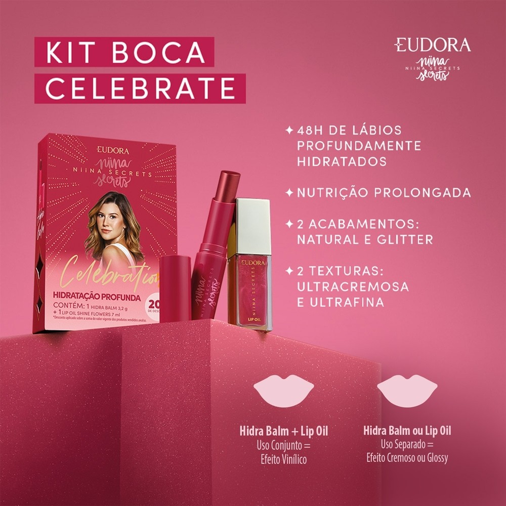 | Eudora Niina Secrets Celebration Hidra Balm 3,2g + Lip Oil Shine Fl... este produto | R$ 62,99 | — | 5.0/5 | 4 |