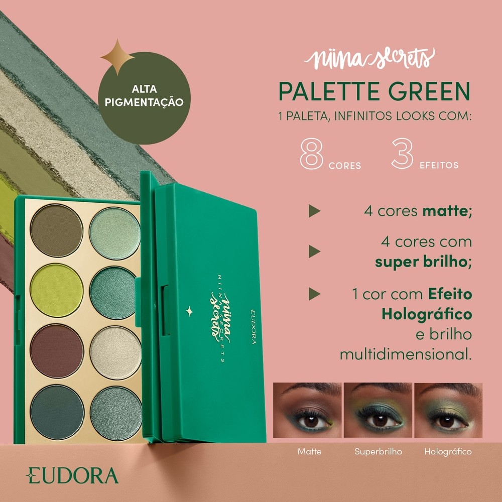 A Palette de Sombras Niina Secrets Green permite explorar diversas possibilidades para compor a sua make e a sua coleção de palettes em tons de verde. Com cores tendência e intensas, com tons de sombra verde e terrosos, traz pigmentação extrema com alta fixação em cores que descarregam na 1° aplicação. -1 Palette, infinitos looks com 8 cores e 3 efeitos diferentes: -4 cores matte conforto, -4 cores com super brilho, sendo uma cor com efeito Holográfico e brilho multidimensional. Nenhum produto Eudora é testado em animais, ou seja, este item possui selo Cruelty Free. **** IMPORTANTE: Não vendemos para contas CNPJ, evite que seu pedido seja cancelado! ****