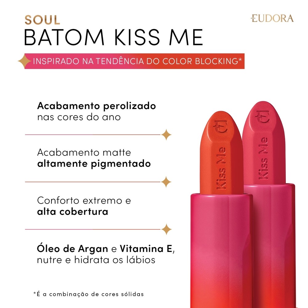 Prepare-se para um visual moderno e cheio de atitude com o Batom SOUL KISS ME Laranja Trendy Matte Eudora! Inspirado na tendência do color blocking, ele traz um tom laranja alegre e moderno.Sua embalagem color blocking, com efeito degradê complementa a sua make com um toque fashionista. A textura matte proporciona uma cobertura impecável. Sua fórmula enriquecida com Óleo de Argan e Vitamina E nutre e hidrata os lábios durante o uso, proporcionando conforto e maciez. Cor Intensa e VibranteAcabamento Matte:Conforto e HidrataçãoAlta CoberturaProteção FPS 15 O Batom SOUL KISS ME Laranja Trendy Matte Eudora é a escolha ideal para mulheres que amam cores vibrantes e buscam uma make com acabamento impecável e conforto para os lábios. Nenhum produto Eudora é testado em animais, ou seja, este item possui selo Cruelty Free. **** IMPORTANTE: Não vendemos para contas CNPJ, evite que seu pedido seja cancelado! ****