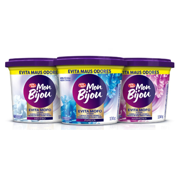 Evita Mofo Mon Bijou Neutro, embalagem contendo 130 gramas, é seu principal aliado contra mofo, fungos e odores, pois absorve a umidade e deixa um perfume agradável. Dicas: Limpe bem o local onde houver mofo antes de colocar o produto. O produto inicia sua ação de imediato e age por um período médio de 5 semanas, de acordo com a umidade presente no ambiente. Atenção: Fique atento ao nível água no fundo do produto. Quando chegar na marca indicada, descarte-o.