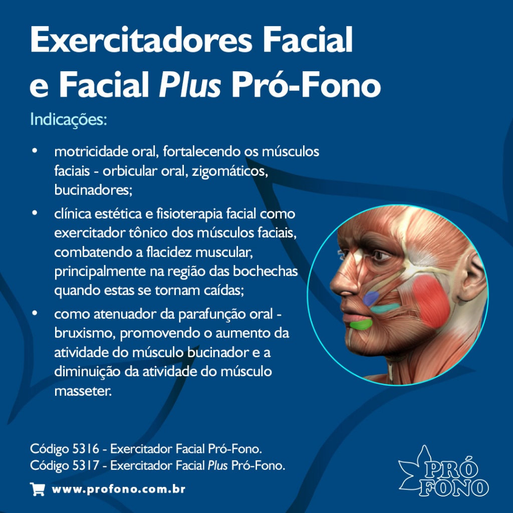 Nome completo do produto: Exercitador Facial Pró-Fono Plus. Lançamento: 2004. Responsabilidade Técnica: Heliane Campanatti-Ostiz – CRFa 1678/SP. Registro no MS: 10368380024. Contém: 1 exercitador facial plus; 1 bula do exercitador facial Pró-Fono plus. O Exercitador Facial Pró-Fono Plus (vide Figura), idealizado pela fonoaudióloga Renata Savastano Ribeiro Jardini, apresenta o dobro de resistência nas molas do que o Exercitador Facial Pró-Fono. É composto por duas bases plásticas de cerca de 2cm por 4cm, planas, que se encaixam na região intra-oral, na região vestibular das bochechas. No encontro das bases plásticas com as hastes metálicas há uma reentrância para acoplamento nos ângulos dos lábios, direito e esquerdo. As duas bases plásticas são unidas por duas hastes de fio de aço inoxidável com 12cm de comprimento total, com uma helicoidal (efeito mola) na metade de cada fio de aço. 1. Bases plásticas. 2. Reentrâncias para acoplamento nos ângulos dos lábios. 3. Hastes de fio de aço inoxidável. Indicações: 1. Especial para faces mais largas encontradas no sexo masculino, nas pessoas com tendência à obesidade ou àquelas pessoas que já utilizaram o Exercitador Facial Pró-Fono (metade da força) e querem intensificar os efeitos da exercitação produzida. 2. Como auxiliar no tratamento fonoaudiológico – motricidade oral – fortalecendo os músculos faciais, orbicular oral, zigomáticos e principalmente bucinadores. 3. Na clínica estética e fisioterapia facial como exercitador tônico dos músculos faciais, combatendo a flacidez muscular, principalmente na região das bochechas quando estas se tornam caídas. Observação 1: antes de iniciar o uso do Exercitador Facial Pró-Fono Plus observe e toque atentamente sua face diante de um espelho, reparando nos detalhes e marcas, rugas, proeminências e textura, principalmente na região das bochechas, a fim de que possa avaliar a evolução. Observação 2: o Exercitador Facial Pró-Fono Plus tem sido utilizado por muitos indivíduos, com resultados comprovados por meio de pesquisa científica. Estudos eletromiográficos foram desenvolvidos pela idealizadora do produto, confirmando as alterações musculares descritas no item Indicações desta bula. Modo de usar: as bases plásticas são introduzidas na região intra-oral, entre as bochechas e os dentes. As reentrâncias existentes encaixam-se nos ângulos da boca, direito e esquerdo, permitindo que o aparelho fique com os fios de aço externos à boca, sem contato com os dentes. Ao introduzir o Exercitador Facial Pró-Fono Plus, a boca distende-se no sentido horizontal, pela força do efeito da mola. O usuário faz força de compressão das bochechas, tentando fechar o aparelho, aproximando as duas bases plásticas contra os dentes, sem no entanto tocá-los, produzindo assim a contração dos músculos envolvidos. Os lábios mantêm-se entreabertos, deixando, se possível, os dentes à mostra. Exercícios recomendados: 1. Fechar lentamente o aparelho, pela força de compressão das bochechas. Soltar lentamente o aparelho, relaxando os músculos. Durante o exercício manter os dentes em oclusão natural e os lábios entreabertos, de modo mais relaxado possível. 2. Fechar o aparelho e mantê-lo preso pela força de compressão das bochechas, por cerca de 15 segundos. Durante o exercício manter os dentes em oclusão natural e os lábios entreabertos, de modo mais relaxado possível. Tempo de uso: variado, conforme as necessidades da reabilitação e a tolerância do usuário, podendo ser realizadas 3 séries de 20 vezes cada, divididas ou não durante o dia. Caso ocorra dor, diminuir a frequência de uso, não ultrapassando 20 minutos diários. Precauções: 1. Atentar para que o fechamento do aparelho ocorra predominantemente pela força de compressão das bochechas e não pela protrusão dos lábios. Os lábios ao serem arredondados e/ou apertados também comprimem o aparelho, porém minimizam a eficácia do Exercitador Facial Pró-Fono Plus. 2. Observar para que durante a realização dos exercícios não haja abertura nem pressão excessiva da oclusão dentária, evitando-se assim uma sobrecarga na articulação temporomandibular (ATM).