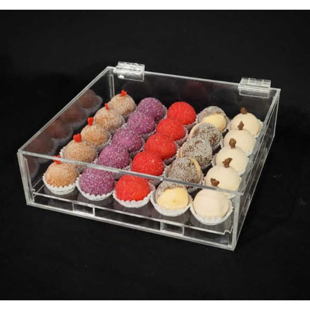 Expositor para 25 brigadeiros tamanho número 4 em acrílico com tampa. Medidas do expositor: 22x22x6cm (L x C x A)