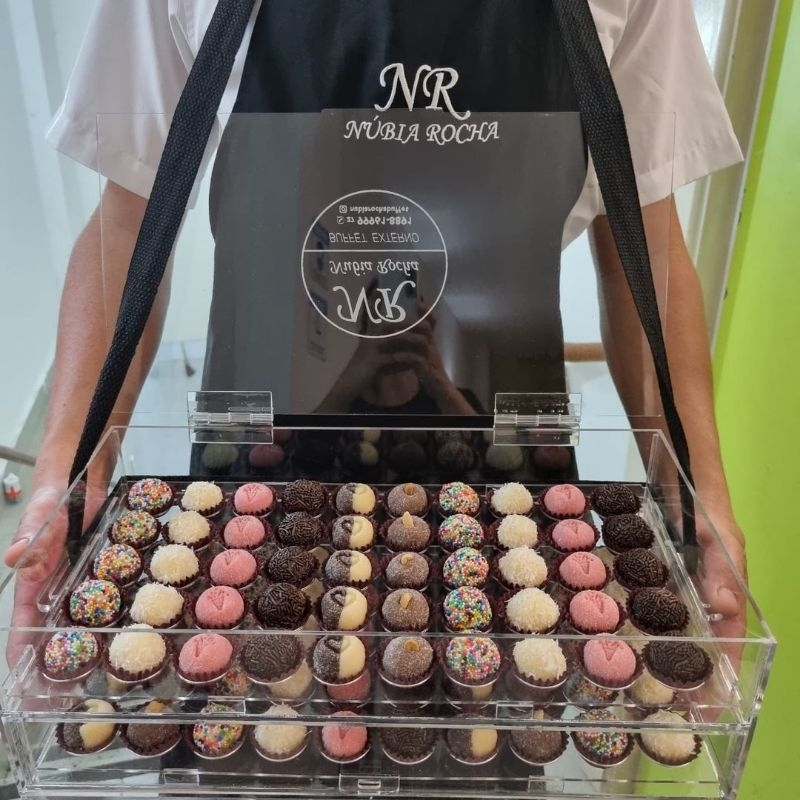Expositor caixa com gaveta para 100 brigadeiros forma Nº5 - ** COM GRAVAÇÃO DA SUA LOGO NA TAMPA** (A logo em arquivo com alta resolução e deve ser enviada IMEDIATAMENTE por mensagem no pedido logo após a compra, por conta do curto prazo de envio. Caso contrario o expositor poderá ser enviado sem gravação) ATENÇÃO ESSE MODELO NÃO CABEM 16 CAIXINHAS , TEMOS O EXPOSITOR MAIOR PARA BRIGADEIROS NUMERO 4 EM NOSSOS ANUNCIOS Inclui: Trava de segurança na gaveta. Alça regulável Nichos removíveis Gravação da sua logo na tampa Pegador de acrílico Medidas: 37cm x 19cm x 11cm Fabricado em acrílico primeira linha 3mm.