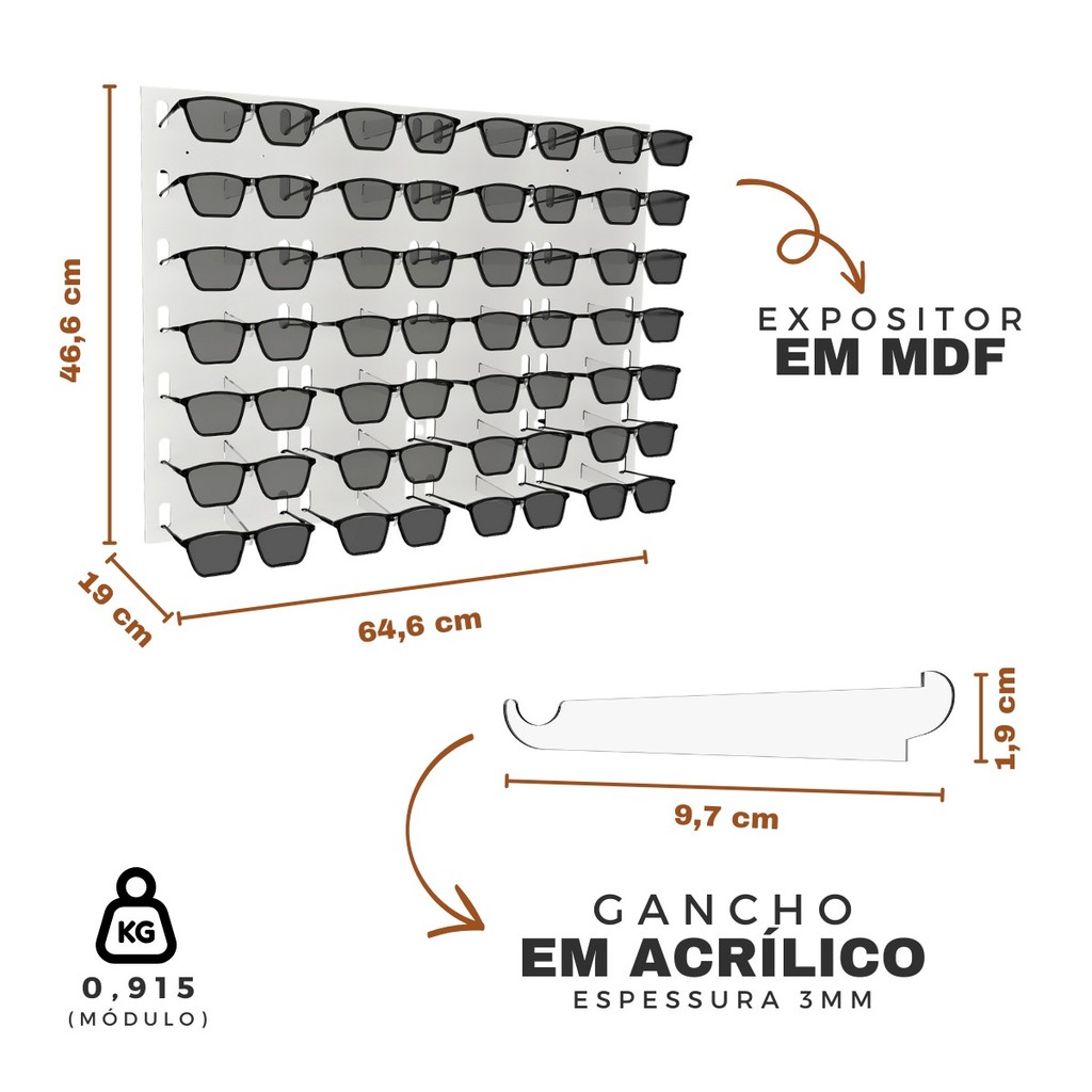 Este expositor de parede para óculos proporciona um toque arquitetônico à loja ou ótica, integrando-se harmoniosamente ao ambiente e adicionando uma dimensão estética que destaca os produtos de forma elegante e sofisticada. DIMENSÕES E PESO DO PRODUTO - Contém: 1 módulo do produto. - Altura: 46,6cm - Largura: 64,3cm - Profundidade: 19,0cm - Peso: 0,915kg ESPECIFICAÇÕES - Cores disponíveis: branco. - Capacidade: 28 óculos expostos. - Estrutura em MDF 3mm. - Haste (gancho de apoio dos óculos) em acrílico 3mm. - Expositor ideal para óculos solares e receituário (ótimo espaço entre os óculos). - Expositor modular (ótima opção para ampliar a quantidade de óculos conforme a necessidade). - Fixação: o expositor é instalado com uma cantoneira para fixação do produto na parede.- Produto de fácil montagem. DIMENSÕES, PESO E VOLUME DA EMBALAGEM - Volume(s): 1 - Altura: 11,0cm - Largura: 71,0cm - Profundidade: 52,5cm - Peso: 2,585kg INFORMAÇÕES GERAIS - Óculos e objetos decorativos não acompanham o produto. - Imagens meramente ilustrativas. - A tonalidade da cor do produto pode variar de acordo com o lote do fabricante; e/ou as configurações de seu monitor. INSTRUÇÃO E CUIDADOS - Limpar com pano levemente umedecido com água, seguido de pano seco. - Não utilizar produtos químicos ou abrasivos na limpeza. - Evite exposição prolongada ao sol. Desde 1997, a Mazzeo Expositores® tem sido líder na fabricação de expositores e suportes para óculos, acumulando mais de 2 décadas de experiência no setor óptico. Contamos com uma ampla variedade de designs, dimensões e formatos de suportes para vitrines, paredes, balcões, expositores de chão, entre outros produtos de alta qualidade.