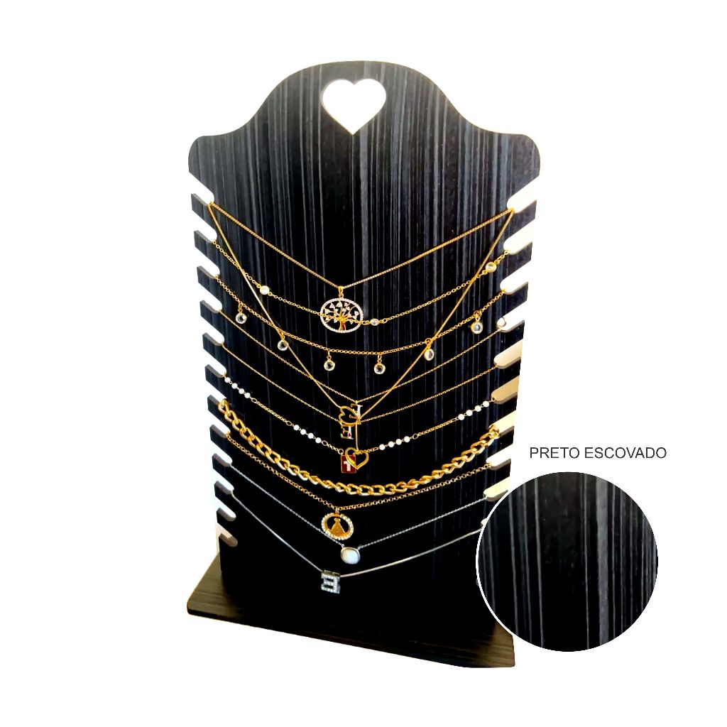 Expositor / Organizador para 12 cordões ou colares. Ideal para lojas de acessório ou para casa, deixando suas peças organizadas. Em mdf 4mm, cortado a laser, pintado a mão com textura estilo ESCOVADO na cor preta. Medidas Altura: 31,5cm Largura: 18cm Profundidade: 7cm O produto é enviado desmontado. Para o uso basta encaixar. Caso prefira, pode colar com cola branca ou cola instantânea. Produto em pronta entrega. Envio imediato. Caso precise de uma maior quantidade, entre em contato conosco.