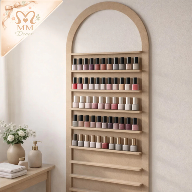 O Porta Esmalte de Parede com Arco é a solução perfeita para organizar seus esmaltes com charme e personalidade. Fabricado em MDF 6mm, possui 10 prateleiras espaçosas e um arco decorativo que permite personalização criativa com LEDs, flores, adesivos e muito mais. Ideal para salões de beleza e também para montar um cantinho de autocuidado em casa, mantendo tudo à vista, organizado e com um visual moderno. 📏 MEDIDAS Espessura: 6mm Altura total: 1,56 m Largura externa: 72 cm Largura interna (área útil): 62 cm Prateleiras: 10 unidades Cada prateleira: 60 cm (comprimento) x 5 cm (largura) Profundidade útil: 5 cm ⭐ BENEFÍCIOS Organiza e expõe seus esmaltes de forma prática e bonita Arco decorativo ideal para personalização do seu jeito Visual moderno, leve e funcional Instalação simples: prateleiras com buchas e parafusos (mais firmeza) Desmontável, facilita transporte e montagem Perfeito para salão, estúdio de unhas e cantinho de beleza em casa