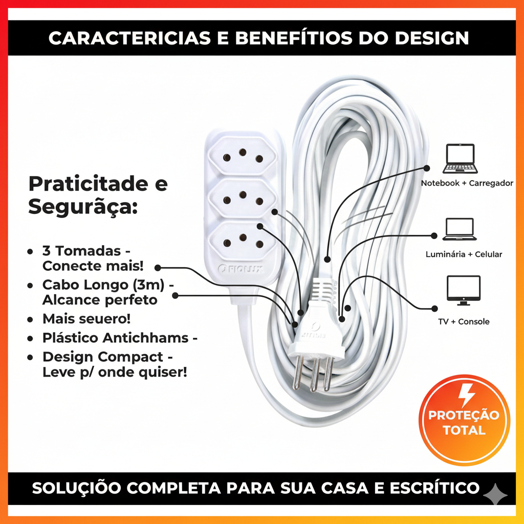 BENEFÍCIOS: 🏷️ Marca: Plug Plus 🛠️ Material: Corpo em termoplástico resistente Cabo flexível de alta durabilidade Pinos metálicos reforçados Tomadas padrão brasileiro (3 pinos) 📏 MEDIDAS: Comprimento do corpo: 18 cm a 25 cm Largura: 4 cm a 6 cm Altura: 2,5 cm a 4 cm Comprimento do cabo disponível: • 2 metros • 3 metros • 5 metros • 10 metros Potência Máxima: • 127V – até 1270W • 220V – até 2200W Modelo 10A Bivolt 127V / 220V ⭐ VANTAGENS DO PRODUTO: ✅ Permite ligar vários aparelhos simultaneamente ✅ Ideal para TV, computador, videogame e carregadores ✅ Design discreto e moderno na cor branca ✅ Cabo resistente e seguro ✅ Excelente custo-benefício para uso residencial ou escritório ℹ️ IMPORTANTE: Não utilizar acima da potência indicada. Evite ligar aparelhos de alta potência simultaneamente. Produto indicado para eletrônicos e equipamentos domésticos. Compra Segura Com Garantia Shopee ✅ Somos Vendedores Indicados Pela Shopee. ✅ Enviamos dentro de 6 horas úteis. ✅