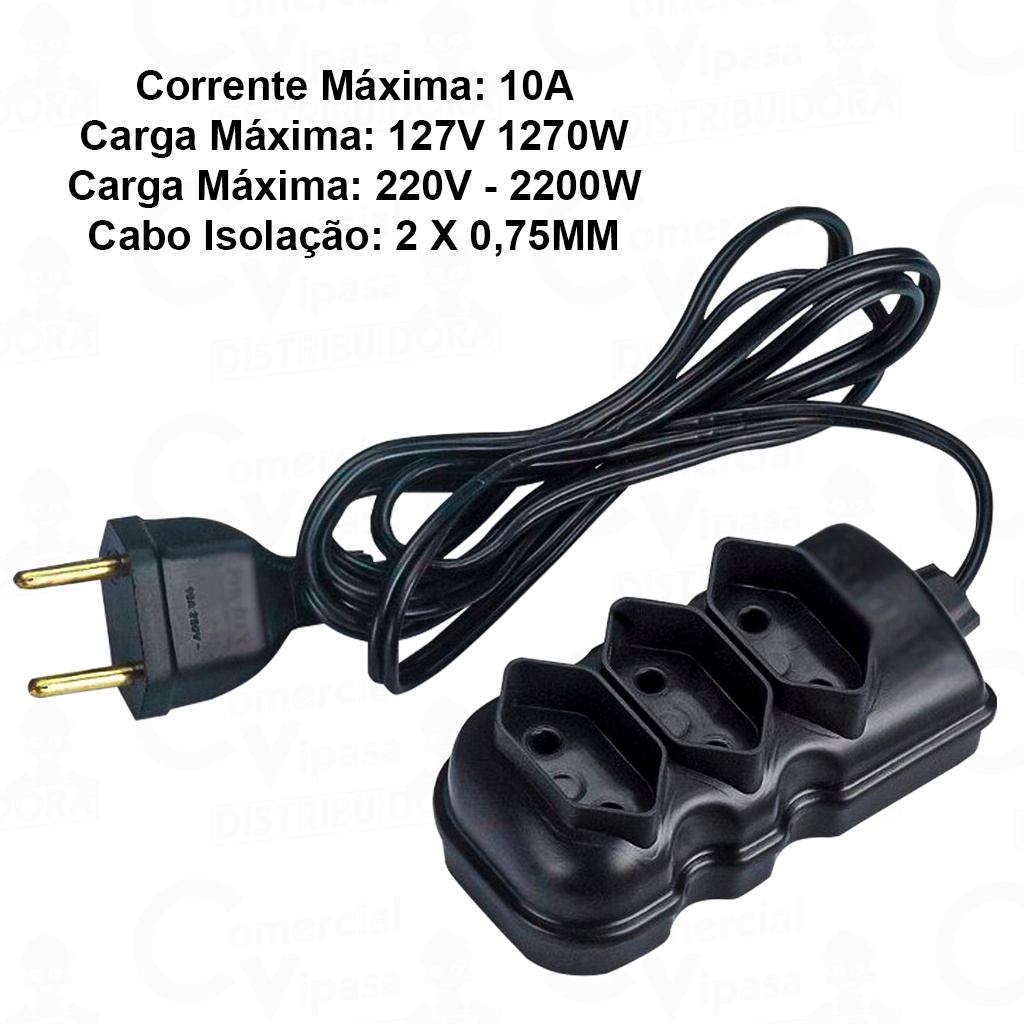 Extensão Elétrica 3 Ou 5 Metros Bipolar Preta Com 3 Tomadas Uso Geral Resistente Casa Comércio