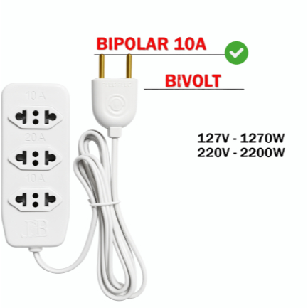 ********** ENVIO RÁPIDO *********** ----------------------------------------------------------------- Extensão Elétrica 3 Tomadas Tripolares Cabo Prolongador Bivolt 10A 1 / 2 / 3 / 5 e 10 Metros OBS: Uso não recomendado para 20A (apenas aparelhos de baixa potencia). * 3 Tomadas tripolares ( entrada 10a ) * Cabo com 2 ,3,5 ou 10 metros * Bivolt * Cor Branca INFORMAÇÕES TÉCNICAS condutor paralelo CABO 2 x 1mm Potência máxima em 127V : 1270W Potência máxima em 220V : 2200W Tensão máxima:250V CONSTRUÇÃO TÉCNICA Condutor : Cobre eletrolitico pvc Tomada: injetada em polipropileno com terminais em latão Plug: injetado em PVC com terminais em latão Certificação válida para o plugue Certificação válida para a tomada Ideal para Eletrodomesticos em geral! PC, Notebook, TVs, SOM/Rádios e outros aparelhos elétricos que precisem de uma extensão. Extensão elétrica barata, melhor custo x beneficio.