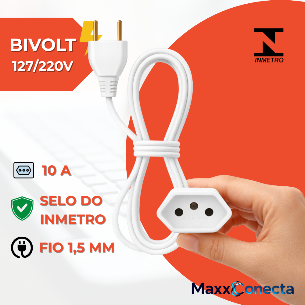 Extensão Elétrica, Cordão Prolongador, Chicote, Branco ou Preto | 1 metro, 10A, cabo bipolar de 1.5mm 2 pinos #MCad1m
