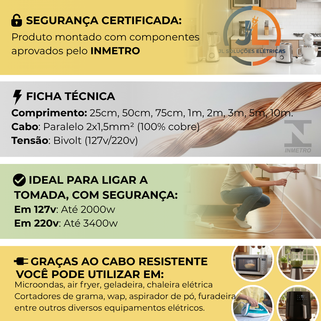 ⚡ Extensão Elétrica Industrial Reforçada – Bitola 1,5mm² – Segurança Máxima 🔌 Se você busca uma extensão que suporte mais do que apenas o básico, este é o produto ideal. Montada com cabo de 1,5mm², ela oferece muito mais resistência e capacidade de carga que as extensões comuns, sendo perfeita para quem não abre mão da segurança. Disponível nos tamanhos: 5cm, 25cm, 50cm, 75cm, 1m, 2m, 3m, 5m, 10m. 🔹 Por que escolher o cabo de 1,5mm²? 🚀 Maior Potência: Suporta aparelhos mais fortes sem aquecer o cabo. 🛡️ Durabilidade Superior: Cabo mais espesso e resistente a dobras e uso constante. 🔒 Segurança Certificada: Produto montado com componentes aprovados pelo INMETRO. 🛠️ Ficha Técnica (Capacidade Real) Cabo: Cabo Paralelo de 1,5mm² (Cobre). Tensão: Bivolt (127V / 220V). Potência Máxima Suportada: Em 127V: 2000W Em 220V: 3400W ✅ Ideal Para Ligar com Segurança: ⚡Graças à bitola de 1,5mm², você pode utilizar em: Eletrodomésticos: Geladeiras, Freezers, Micro-ondas, Air Fryer e Máquinas de Lavar. Ferramentas Elétricas: Furadeiras, Lixadeiras e Serras Tico-tico. Eletrônicos Premium: PCs Gamer, Workstations e TVs de grandes polegadas. Cozinha: Batedeiras, Liquidificadores e Multiprocessadores. 💎 Vantagens de comprar com a JL Home: Garantia de Qualidade: Testamos cada unidade antes do envio. Postagem Expressa: Envio em até 24 horas úteis. Risco Zero: Se não ficar satisfeito com a robustez do produto, aceitamos a devolução. 🔴 Chega de extensões que derretem! Invista em um cabo de 1,5mm² e tenha tranquilidade total.