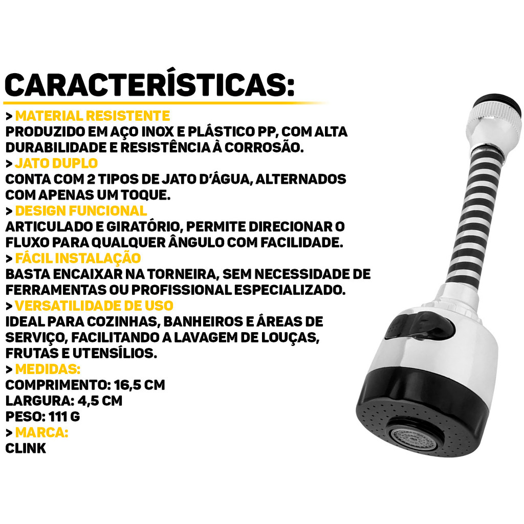 Extensor Torneira com Arejador Inox 16,5cm X 4,5cm Clink O Extensor de Torneira Clink é a solução prática e eficiente para melhorar o uso da sua torneira, oferecendo duas opções de jato: chuveirinho ou jato reto. Fabricado em aço inox resistente e plástico de alta qualidade, este extensor é durável e fácil de instalar em qualquer torneira padrão. Com seu arejador integrado, ele mistura ar à água, reduzindo o consumo sem perder a sensação de volume no jato. Isso significa uma economia significativa de água sem abrir mão do conforto. A função são ativada facilmente com um botão para escolher entre o jato tradicional ou o chuveirinho, garantindo versatilidade para lavar louças, vegetais ou realizar outras tarefas do dia a dia. Além disso, o extensor possui design rotativo 360º, que permite ajustar o ângulo do jato conforme sua necessidade, proporcionando ainda mais praticidade e conforto no uso diário. Características: > Economia de água sem perder eficiência no fluxo; > Dois tipos de jato para diferentes usos; > Instalação simples e rápida; > Durabilidade garantida com material inox resistente; > Uso versátil para cozinha, área de serviço. Especificações: > Material: Aço inox e plástico resistente; > Cor: Inox (prata); > Dimensões: 16,5 cm (comprimento) x 4,5 cm (diâmetro); > Funções: Jato reto e chuveirinho com botão seletor; > Arejador integrado para economia de água; > Rotação de 360° para ajuste do ângulo do jato; > Fácil instalação em torneiras padrão. - Marca: Clink - Garantia: 90 dias contra defeitos de fabricação Vantagens de comprar na Brester: - Produto a pronta entrega. - Produto novo, com garantia de fábrica. - Nota fiscal para Pessoa Física e Pessoa Jurídica.
